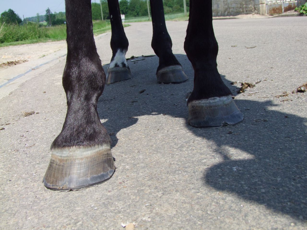 | Dire merci | Voila une photo qui date d'un parage de juin 2010 antérieur gauche (dc là à droite), on voit en pleins milieu la petite fente. ça fait ça depuis tout ce temps. à chaque parage il recreusait, mais ça ne s'améliorait pas. là il a fort creuser, il est allé jusqu'au bout, je voyais bien le "trou" du microbe à travers les fibres, il a creusé jusqu'à ce qu'on ne le voit plus. à priori ça devait repartir ... j'espère. Il m'a montré ensuite tout les endroits potentiels , c'est assez flippant !! |