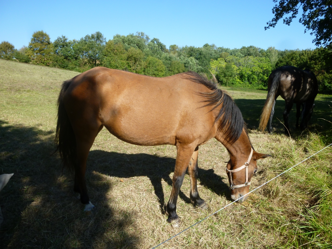 | Dire merci | Top Erzie et Taraa ! Moi début du mois sport, entre Gabin qui a fait une mini collique spasmodique et Clair qui a fait la cascadeur (trou dans le genoux, pansement et lui continue de faire son andouille a tour de bras) je dirais que ça va ! Bon poids je surveille vu les variations de température et l'herbe les coliques fourbure et tuti quantu Poney tondu, ils sont en imper la journée depuis aujourd'hui et en 200 g la nuit avec du foin même si il reste de l'herbe |