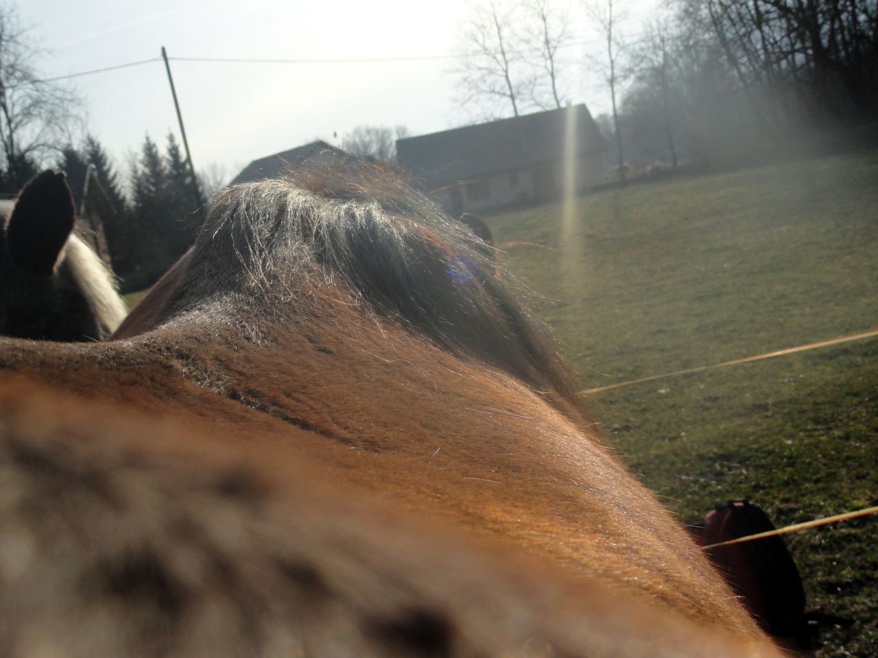 | Dire merci | Des câlins, on en fait tout le temps de toute façon. Je me pose dans son box sur le foin avec un bouquin et il vient quand il veut, pendant le pansage ou il sait très bien me faire comprendre ce qu'il préfère, en promenade à pieds pendant qu'il broute... Mais j'avoue que me retrouver dessus ne serai-ce que quelques minutes juste pour sentir son odeur, ses muscles qui bougent, voir ses deux petites oreilles bien droites, c'est encore autre chose. Inconsciemment, c'est aussi, je sais que je ne veux pas accepter qu'il vieilli et je ne veux pas renoncer à pouvoir sur un coup de tête me poser dessus pour l'emmener brouter, regarder les copines travailler ou le faire patauger dans la rivière. |