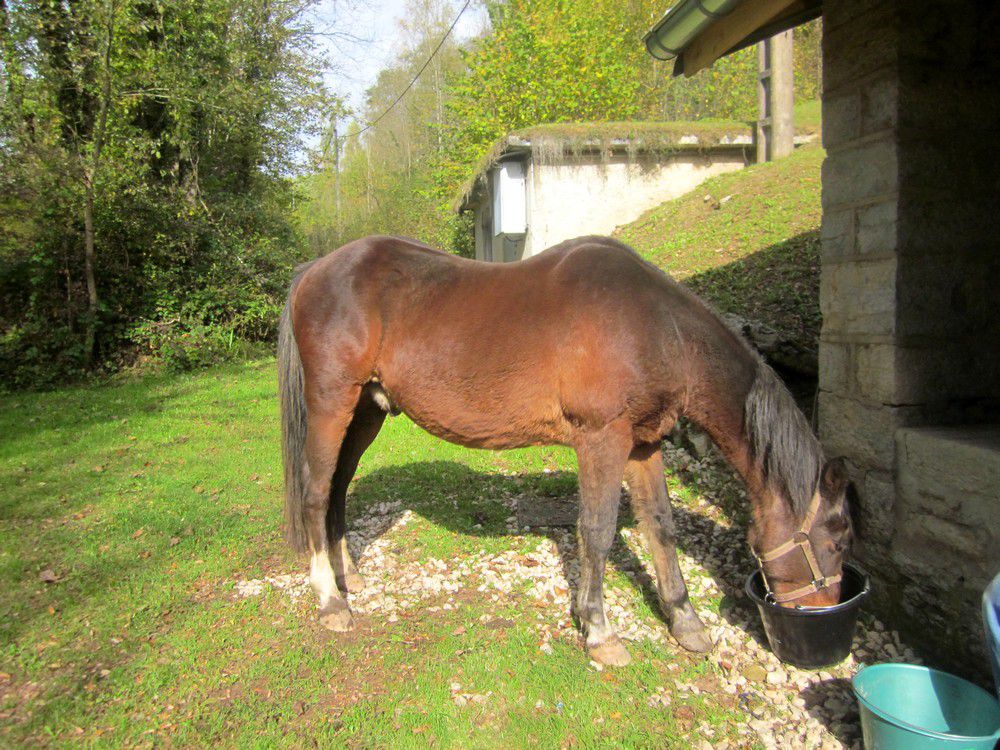 | Dire merci | grande nouvelle : mon papi a bien grossi !!!! je suis vraiment super contente, en 3 semaines il est méconnaissable, on ne voit plus du tout ses côtés, il a pris du gras et muscle au niveau du dos et ses cuisses se touchent J'ai fait faire un "bilan nutritionnelle" de sa ration par une copine qui a fait ses études là dedans. Et donc au final, elle m'a calculé sa ration, et c'est la même que ce que je donnais. Donc par jour, en 2 fois, 3 litres de floconnés stud + 1 litre d'orge germé + 1 litre de betterave déshydratée, mais juste une cure d'un sac, soit 1 mois (à renouveller en janvier) Il est encore à l'herbe verte, mais aura 15kg de foin par jour l'hiver. En plus il a une de ses pêches, il a été referré de l'avant et on voit l'ostéo dans 15 jours car il est pas carré en balade au pas (mais pas au trot, ni galop )Je suis tellement contente car j'appréhendais l'hiver ! |