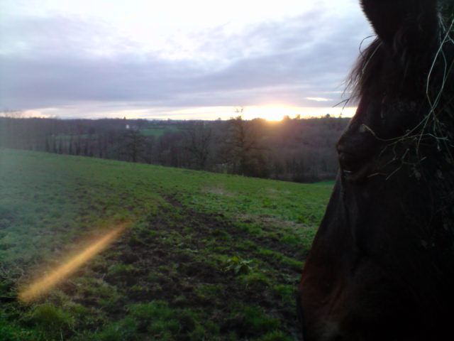| Dire merci | Dimanche Pilgrim n'a pas voulu sortir...j'ai dût aller le chercher dans l'enclos alors que d'habitude il vient tout seul...C'est vrai que notre dernière sortie avait été musclée!(remise au plis suite au coup de pied). On a fait un petit tour et pause broutage,mais j'ai bien ressenti que monsieur n'étais pas là Après sortie de Kalou en longe avec Nell...Au début la vieille était très raide, et au fur et a mesure de la distance, au pas,madame retrouvait des allures plus souples.Nell était en tête, ravie d'une sortie sur des nouveaux chemins,c'est une aventurière celle-là! |