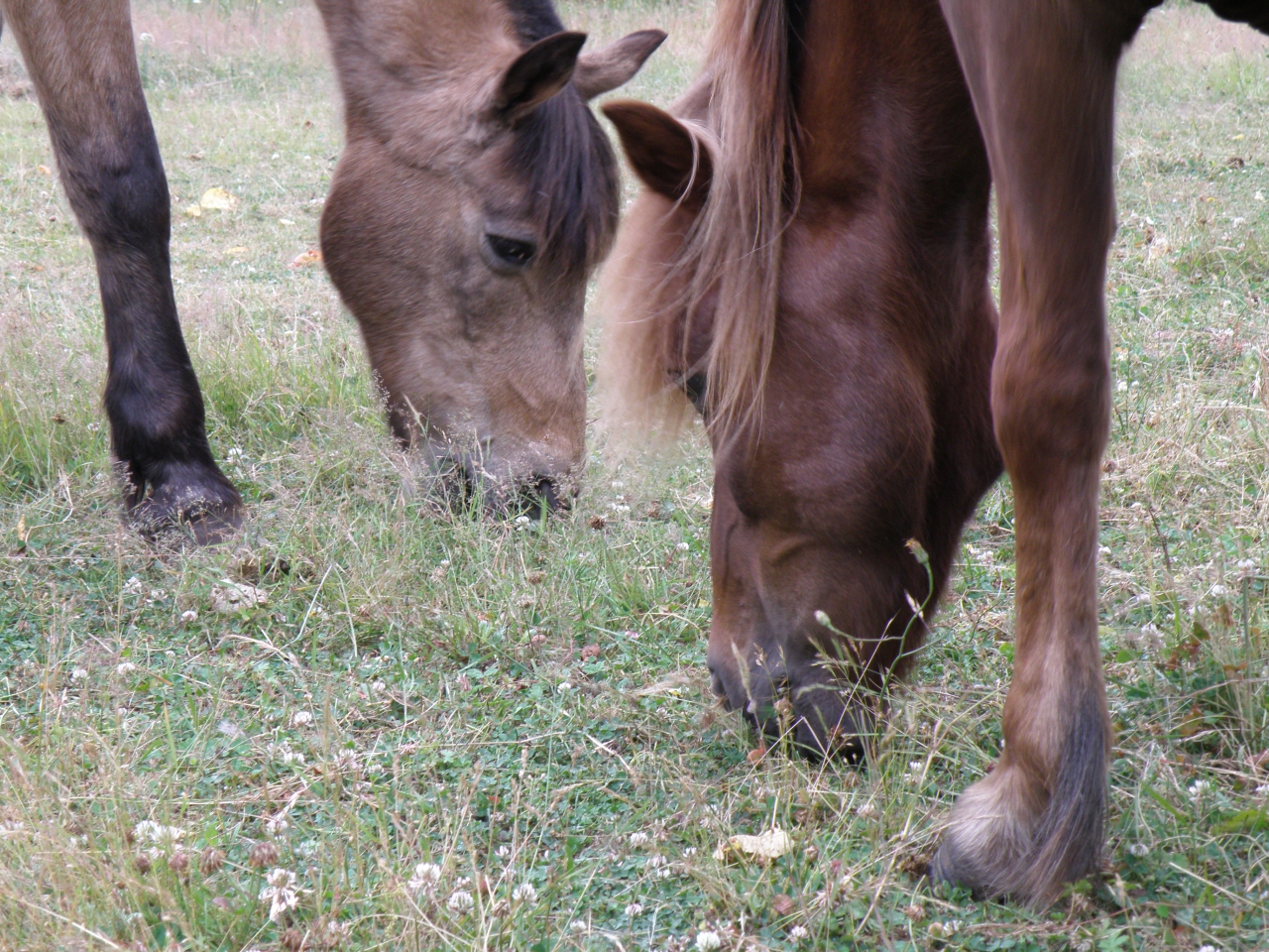 | Dire merci | Toujours trop maigre, vieux Ully de 29 ans, mais bon, depuis la visite dentiste, il remange un peu d'herbe , et grossi doucement!Il était fait par la véto avant, mais ça fait presque deux ans qu'il ne mangeait quasiment même plus d'herbe. J'ai trouvé un dentiste équin qui a accepté de faire pas mal de chemin juste pour mes deux chevaux, et je suis enchantée! Ully fait encore quelques "boulettes", mais rien qu'aux crottins, en nombre et qualité, je vois la différence! Il est aussi plus rassasié, même avant les rations. Je continu de doper au foin haché réhydraté, et à l'aliment haute digestibilité... ![]() |