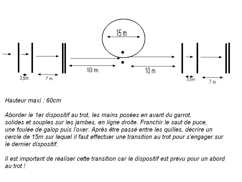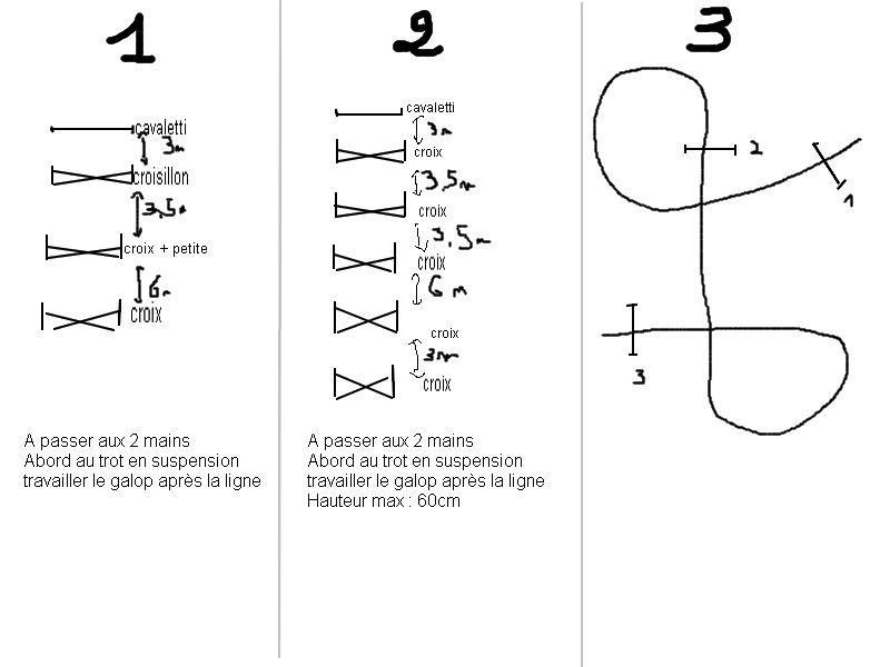 | Dire merci | clair que les derniers dispositifs vaut mieux avoir un cheval routiner un minimum et surtout beaucoup de place! a ne surtoutpas tenter dans un manège de 40mètre ou dans une carrière de 60m. (en additionnant toute les distances on tombe déjà à environ 40mètre, alors si faut travailler un peu le galop avant et après.... tout le monde à pas une carrière de 100 mètre de long quoi. |