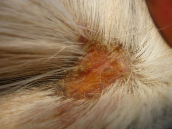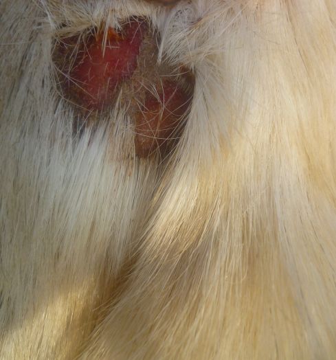 | Dire merci | Alors voilà les photos que j'ai prises hier : De chaque côté de la queue : ![]() ![]() Sous le ventre à force de se gratter : ![]() Petite plaie sur un côté de la tête : ![]() Sous les croutes des plaies près de la queue, c'est un peu 'humide"... |