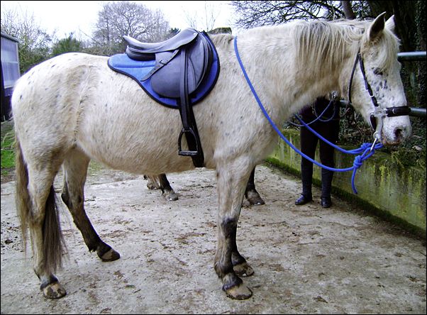 | Dire merci | selle Loison sur commande, noire et bleue avec liseret blanc + tapis Gaston mercier noir avec sacoches en cuir bleu:![]() filet/licol en biothane zilco, ma dernière acquisition: ![]() |