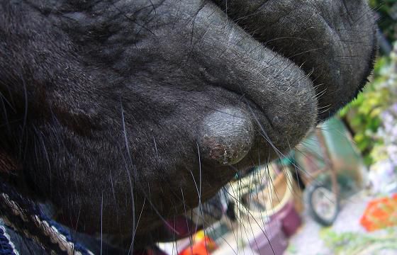 | Dire merci | Depuis plusieurs mois, Lomé a une sorte de bouton en dessous de la lèvre (du côté droit). On a remarqué ça cet automne, ça faisait un petit truc gonflé (un peu moins que maintenant), au bout de 3 ou 4 jours, il y a eu une croûte, ça faisait très piqûre d'insecte... La croûte a disparu, la boule est restée. Ce n'est pas chaud, mais c'est dur, et ça n'a pas l'air de le gêner... Le plus idiot, c'est que la véto est venue pour les vaccins il y a 10 jours, elle a regardé ses dents, mais n'a pas vu la boule, et moi, ça m'était complètement sorti de la tête...j'ai oublié de lui en parler. Je le monte très rarement, et quand je mets le filet, je suis à sa gauche, c'est vrai que ce truc ne me saute pas aux yeux... Mais quand même...qu'est-ce que ça peut être ? ![]() |