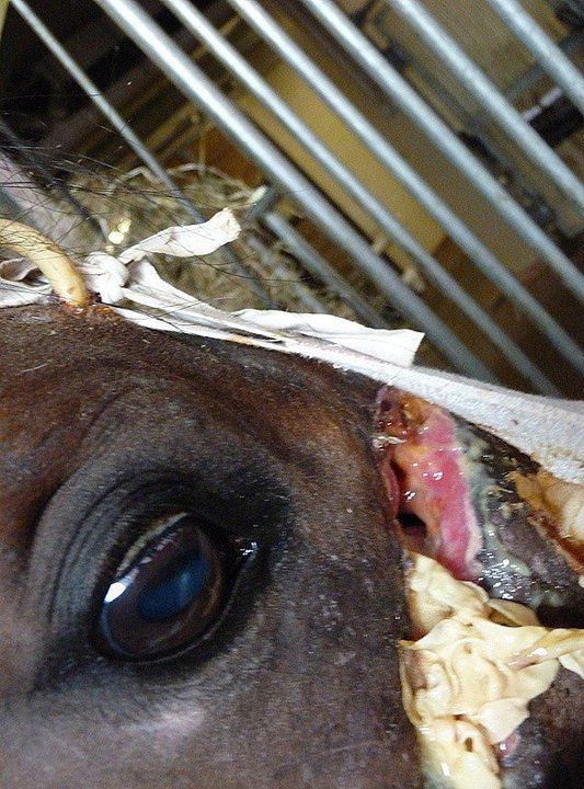 Pokupka a maintenant juste une gaze protectrice, plus de bandage qui gratte ! ![]() Ma puce n'a pas perdu trop de poids ! ![]() Plaie de Pokupka, un peu trop sombre ... ![]() Avec la perte osseuse sur le chanfrein, Pokupka semble plus typée sur cette photo ... ![]() Tibet ![]() La plaie de Tibet est très sale, il purule beaucoup. ![]() ![]() Le pus est encore très présent ... Sur cette photo, on voit bien les cerclages métalliques qui tiennent les os en place (petite torsade juste au-dessus de la plaie). ![]() ![]() Une autre vue de la plaie, on voit le trou avec les sinus ouverts, la torsade du cerclage et la partie supérieure de la plaie qui a cicatrisé ![]() Je suis si triste d'avoir à voir cela au lieu du beau visage de mon étalon ... ![]() Miam, je vais manger la brosse avec laquelle Bé a brossé Poku ma chérie ! ![]() |