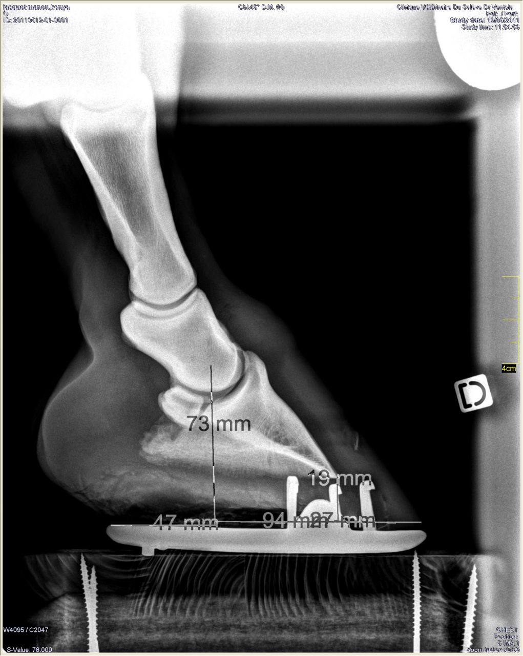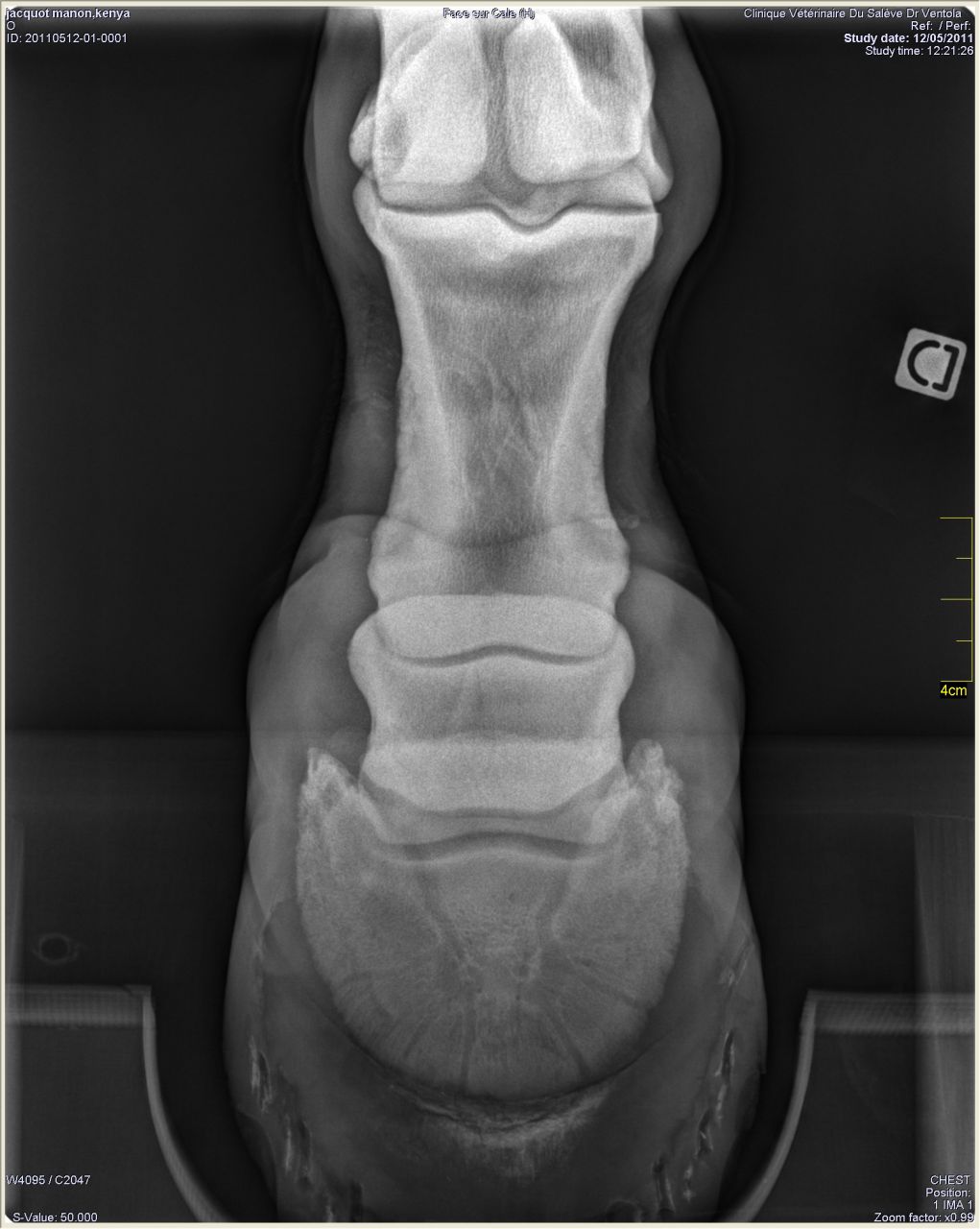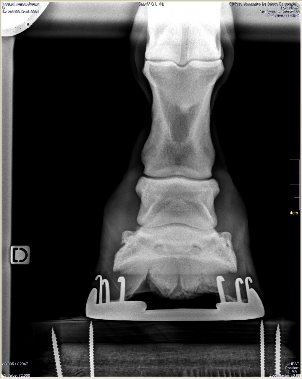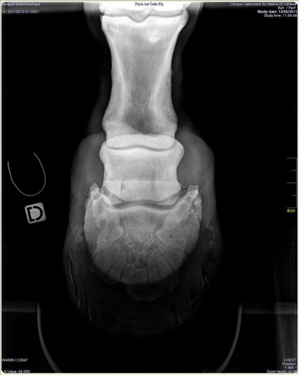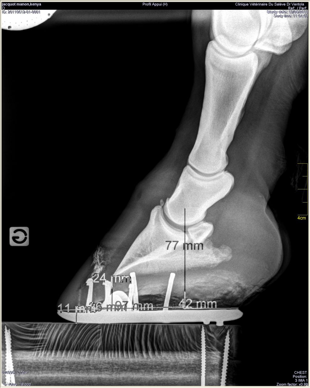 | Dire merci | Donc les radios: Antérieur gauche de profil où on peut voir le petit bout d'os au somment entre les phalanges 2 et 3 ![]() On peut noter un autre souci: normalement le milieu de la 2ème phalange doit être aligner avec le milieu du pied (c'est ce que représente le trait vertical marqué 77mm). Or ici le pied est à 2/3 devant. Ce qui a un effet levier et fatigue donc les tendons de la jument. Le pied gauche de face à plat: ![]() On peut remarquer que la 1ère phalange n'est pas nette (le véto m'a dit qu'on dirait une radio d'un cheval de 20ans.... :/) Le pied gauche de face en extension: ![]() |
