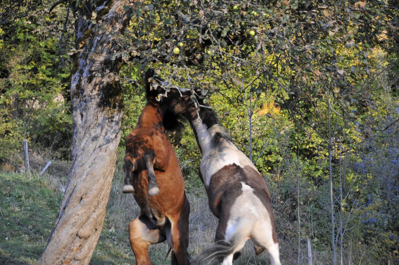 | Dire merci | Moi aussi j'en ai un ^^ Twist Ru flavien, par Kinesitepas et Hulotte Ru flavien. Poney poisse : cataracte congénitale depuis sa naissance, donc invendable, ma grand mère (éleveuse) nous l'a donné... Quelques mois après sa naissance, sa mère meurt de coliques... il est donc nourrit au biberon : un poney très (trop parfois) proche de l'Homme, qui a un peu tendance à sauter dans les bras quand il a peur L'été de ses 1 an, il débarque donc chez mes parents (le temps de s'organiser avec un transporteur), il a le droit à un loooong voyage entre Fontainebleau et... Saint martin en Vercors (environ 600km). Poney très sage tout le voyage, un vrai ange d'après le transporteur ! Après quelques jours à l’habituer au licol et à suivre en main, on l'emmène en rando (rando à pied avec ânes et jeunes enfants), et à la pause le soir, il trouve encore moyen de galoper dans tous les sens en poursuivant les ânesses crevées qui râlent un peu. Bref, un vrai ange jusqu'à l'été de ses 2 ans... là avec les montées d'hormones, il se met en tête de sauter sur les ânesses... On aimerait bien le castrer... Mais monsieur ne daigne pas faire descendre ses bouboules Donc on le sépare des filles, et il se retrouve tout seul... Pour ne pas qu'il s’ennuie on le met avec ... des vaches... Si au début la cohabitation est parfaite, il décide un beau jour de "jouer à chat" et les envois plusieurs fois traverser les clôtures... Le fermier était pas ravi ![]() ![]() ![]() donc poney à nouveau tout seul quelques temps... Il devient de plus en plus insupportable (il s’ennuie et veut donc "jouer" avec les gens...), un vrai monstre irrespectueux (qui me fait quelques belles frayeurs...) Heureusement le maréchal ferrant (gérant également un ranch) nous prête son poulain de 2 ans, puis quelques adultes pour leur apprendre la vie... ![]() Rapidement Twist et le jeune deviennent inséparables, et la présence des plus vieux lui remet un peu de plomb dans la cervelle : il redevient gérable à pieds... ![]() L'été de ses 3 ans on commence le débourrage, seul il est très calme, mais dès qu'il voit d'autres chevaux, il devient dingue (toujours entier), ce qui nous vaut quelques balades épiques et un genou en moins pour moi... Enfin, en septembre 2010, opération castration. Mais hélas, avec ses bouboules, il perd énormément d'état, et déprime pendant sa convalescence où il doit rester seul... L'hiver il reprend un peu de gras (mais pas encore assez), et surtout une bonne dose de poil (bah oui, les pieds dans 50cm de neige, ça motive ^^) ![]() Et au printemps on reprend les sorties : au pas presque tout le temps, et quelques foulées de trot de temps à autre. Un peu froussard (si vous l'écoutez il vous racontera que je lui fait traverser des torrents furieux... comprenez un petite résurgence d'eau au milieu du chemin )il est quand même plutôt cool, même s'il teste parfois un peu ![]() ![]() Voilà Message édité le 21/05/11 à 21:03 |