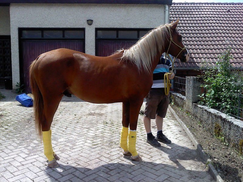 | Dire merci | On a profité d'un rayon de soleil pour faire quelques photos de Bibishah qui a enfin revêtu sa belle robe dorée. Et on a surtout profité de l'absence de l'étalon (parti pour saillie) pour travailler tranquillement le poulain pendant 1 semaine. 20 minutes/jour et voilà poulichon qui marche en main comme un grand (avec la distance de sécurité réglementaire, et sans faire le con) et tourne en longe (2 tours suffiront pour cet été). Il retourne à ses jeux de poulain maintenant que la patriarche est revenu. Il grandit tout doucement, je me demande si sa croissance n'aurait pas pu être bloquée par l'accident de l'année dernière (coup de sabot au coude, os fêlé : antibio et box pendant 2 mois). Qu'à cela ne tienne, tant qu'il dépote sous la selle, peu m'importe qu'il dépasse ou non le mètre 50. ![]() ![]() ![]() ![]() ![]() |