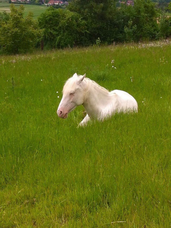 | Dire merci | après 4j sans voir le pitchoune ( avec les travaux d'assainissement ils ont fait une énorme tranchée à l'entrée du chemin d'accès à la pâture, on pouvait juste prier pour que tout ce passe bien au parc...) que de joie de voir son poulain arriver au grand galop avec hennissements pour venir chercher ses câlins et gratouilles. Puis il m'a fait un festival de connerie et de galops ventre à terre |