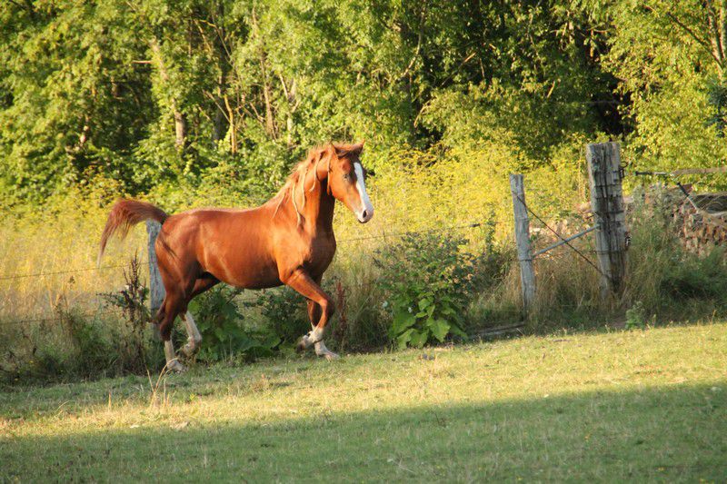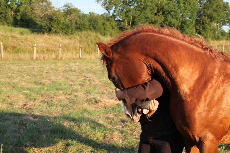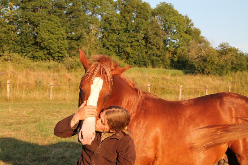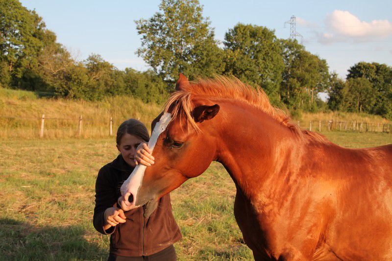 DéconnectéDire merci | Et ben, vous etes actives avec vos B ! Le mien ne glande rien de rien, j'ai pas le temps, il va vraiment falloir que je trouve une cavalière pour me donner un coup de main... Ah si quand même, je l'ai longé quelqeus minutes, pas fait depuis un mois et demi et que deux ou trois fois, je m'attendais à ce qu'il me fasse un peu de cirque, rien du tout, sage et appliqué, et il n'avait rien oublié, surtout pas de repasser au pas à la demande : moins on en fait, mieux on se porte Pour le transport Daelou, j'ai un vrai souci avec Baladin, qui se cabre ou essaye de passer sous la barre, donc je mets des bottes de foin sous la barre pour pas qu'il passe en dessous et j'enroule la longe autour de la barre pour pas qu'il se cabre. J'ai fait une douzaine de transport de 200 m aller retoru jusqu'a ce qu'il ne bouge plus, plus un transport de quelques minutes avec mon vieux, ça le rassure et ça s'est bien passé. On va recommencer demain si tout va bien. Bref, mets du foin sous ta barre et essaye de faire tes transports avec un copain pour rassurer. Les dernières photos sont magnifiques. Boycott a beaucoup changé, il devient vraiment beau. Sinon, pour les chevaux réactifs au montoir, gilet de protection obligatoire : je me suis fait jetée de mon 4 ans il y a quelques jours, j'ai fait soleil en tombant sur le dos, le gilet de cross a amorti la chute, ouf ! Alors ok j'ai plus votre jeunesse, mais quand même, avec les jeunes, c'est mieux ! |