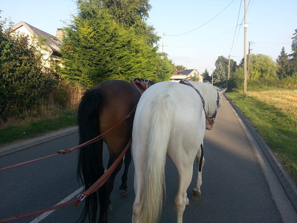 | Dire merci | @sultanjoy : oui en effet j'ai bossé blue avec ma jument pour qu'il soit cool +++ avec . j'ai commencé par les bosser en licol avec ma cousine chacun un en les bossant près mais en les concentrant pour qu'il passe l'un à coté de l'autre qu'il s'ignore, si blue réagissait on le faisait soit reculé ou soit faire des déplacements de hanches selon les circonstances. j'ai bossé ca au printemps de ses deux ans il avait bien assimilé, ensuite il est parti saillir une jument , il est revenu on a continué à bosser ca et ca c'est bien passé, si bien qu'a c'est deux ans et demi on les a mis au longue rêne en pair ensemble. ![]() on en était arrivé à ca ( la jument était bien en chaleur ce jour la ) ![]() [/url] cet été faute de temps j'ai pas put rebosser tout ca, mais au quotidien vu que j'ai les deux à gérer qu'ils sont en pature mitoyenne ca m'a bien aidé, je peux les tenir toute seule en longe , monté sur blue et prendre princesse en dextre. Il a pour l'instant compris que elle c'est pas touche et c'est bien agrèable en balade sachant qu'on est toujours collé^^ une des dernières balade que j'ai faites, ils sont toujours collé comme ca ![]() [/url] |