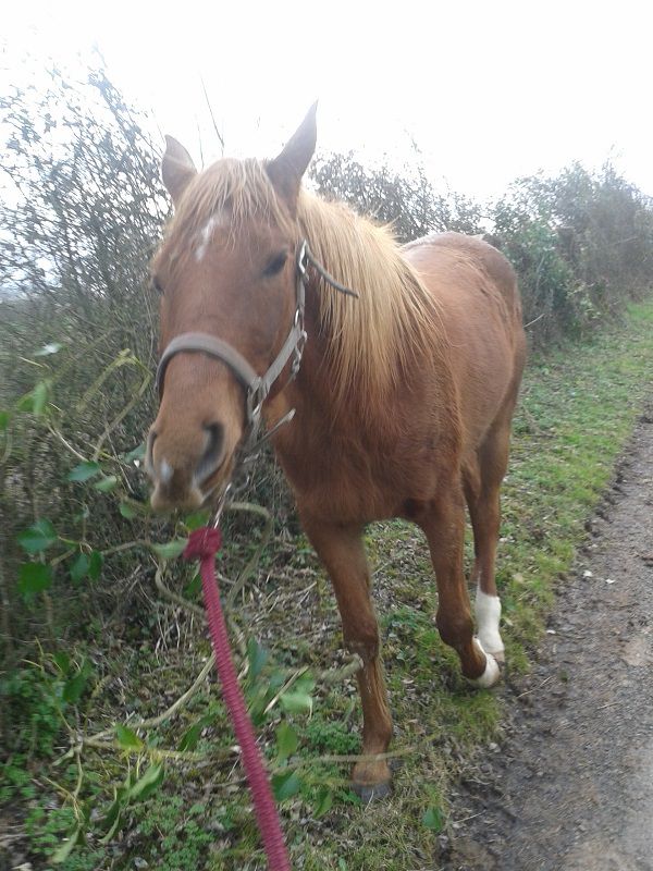 | Dire merci | C'est vrai qu'on dirait que ça fait 15 jours qu'elle a pas mangé. La pauvre petite... Ca y est, j'ai monté Barouf ce matin ! Déjà pour un poulain pas monté depuis des mois, j'ai mis la selle et le filet en liberté dans le box sans problème. Comme un vieux routard... Ensuite direction la carrière à 15min à pied. Puis petite longe de quelques minutes pour la connexion. Pour un cheval sorti uniquement en main depuis 2 jours alors que pas habitué à vivre en box, il était plutôt calme. Donc à cheval avec mon ami qui me tient car je dois bien l'avouer, j'étais flippée. J'ai vraiment perdu toute confiance en moi depuis que j'ai monté un cheval compliqué et qu'on a frôlé l'accident. Bref, quelques tours au pas et il m'a lâché. Donc j'ai monté 10min : transitions, cercles et deux départs au trot. Il est brut de chez brut mais il est gentil ! Et je suis revenue à la maison à cheval, avec deux départs au trot. En conclusion, c'est un petit ange et moi une grosse flippée. Le pauvre |