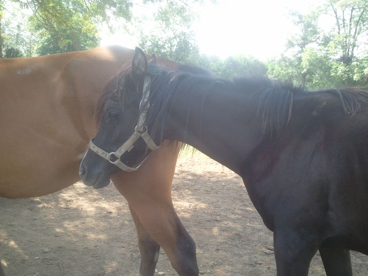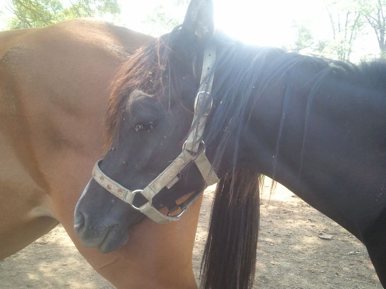 | Dire merci | coucou les filles laury toujours aussi dingue de ton pèpère il a une tete a conneries !!! ici ça va je soigne toujours brouzie ça photosensibilisation c'est transformé en gale c'est la merde a soigner.sinon ayé elle a une copine de pré, je vais pouvoir remettre mon hongre avec mon étalon |