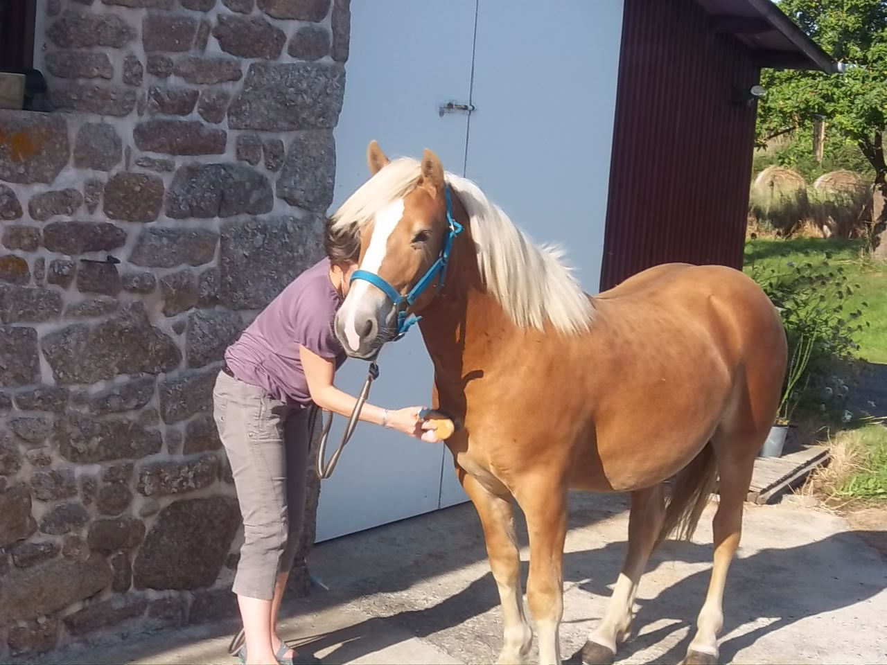 | Dire merci | De mon coté j'ai enfin revu mon B, j'ai pu passer assez peu de temps avec lui cet été, ca faisait un long moment qu'il n'était pas sorti Donc programme chargé :- pansage : sage comme une image ou presque - douche : mh douche des pieds quoi, c'était la première fois et plus que la peur je le soupsonne d'être TRES chochotte. Mais bon dans l'ensemble il n'a pas trop bougé je suis contente- tentative de photo au carré dans la carrière, pas une n'est potable il bougeait trop.. En 10 minutes il a réussit à se coincer la tête dans la longe, puis il avait un bout de longe dans la bouche celle ci a glissé et il s'est retrouvé avec le mousqueton dans la bouche Ce cinéma.. J'ai bien cru qu'il allait se mettre par terre mais ouf ca s'est décoincé- et aujourd'hui : maréchal ! Pour la première fois on ne l'a pas mis à l'aire de pansage ce qui d'habitude l'encadrait. Là il est resté dans l'allée des box comme un grand et n'a presque pas bougé ! |