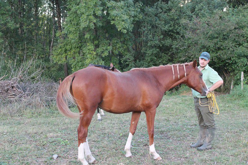 | Dire merci | Ben en fait son propriétaire a eu la fausse bonne idée de l'offrir en cadeau à sa fille pour ses 7 ans. Il a déjà un cheval et un poney mais c'est pas une passion ni pour lui ni pour elle. En plus elle n'est là qu'une semaine sur deux et ne fait pas le poids (125cm pour 30kg environ). Sans compter que ni lui ni elle n'ont le niveau théorique pour gérer seuls le poulain (c'est Vicking qui gère tout le troupeau). Et ni l'un ni l'autre ne prennent de cours donc même si le débourrage est fait par un pro, ils ne sauront pas maitriser un jeune qui fait des bêtises. Donc en gros Bivouac a tous les soins qu'il faut (compléments, maréchal, vermifuges ect.) mais par contre question présence et manipulation en gros il n'a pas SON humain qui s'investit dans leur relation ni dans son "travail" de bébé... |