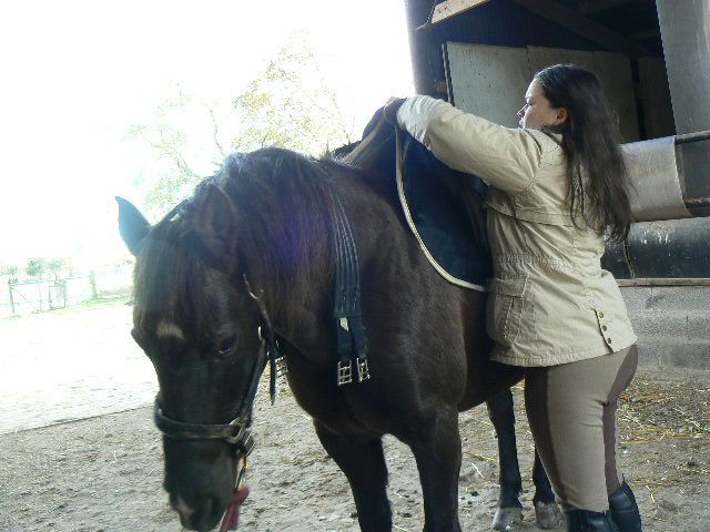 | Dire merci | mon gros a été débourré dans l'optique montoir à côté. J'ai un (petit ) excédant de poids et je suis à moitié cassée de partout. Ben je m'en fiche : vive le plot, la chaisse, le truc assez solide pour me porter le temps de me mettre en selle. Souplesse ? j'ai rayé ce mot de mon vocabulaire, malheureusement, et pas par choix.Ha, oui : mon cheval est un cheval de trait pour couronner le tout. Mon nouveau club ? y a de tout comme chevaux (du PRE de spectacle au trait, le mien), y a de tout comme cavalier (des bouchons de 3 ans en baby-poney au "papy" de 70 ans qui aime son tabouret) mais une seule mentalité : se faire plaisir ensemble. |