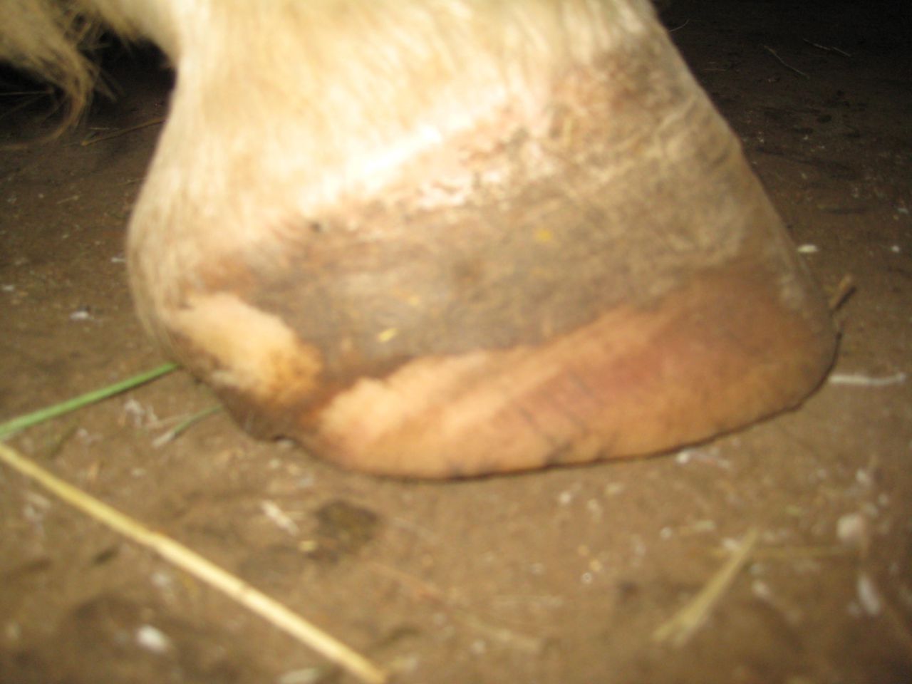 | Dire merci | Seulement aujourd'hui, la nouvelle corne continue de pousser de la même façon et ça m'inquiète un peu. En fait elle est blanchâtre, pas lisse comme le reste de la corne et + molle. C'est normal c'est la corne qui se renouvelle par la couronne. Par contre effectivement, la brosse métallique est réservée à la sole et la fourchette, ne le fait pas sur le sabot et surtout pas près de la couronne. |