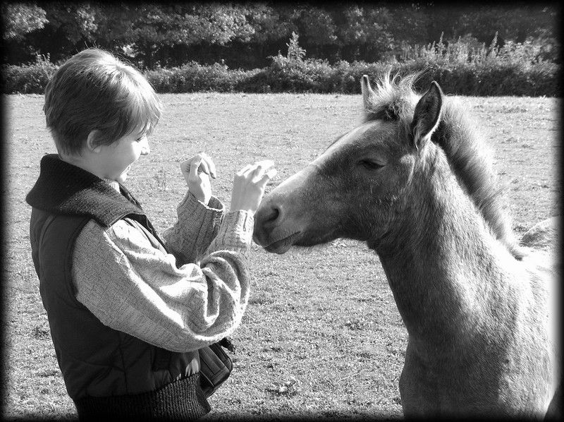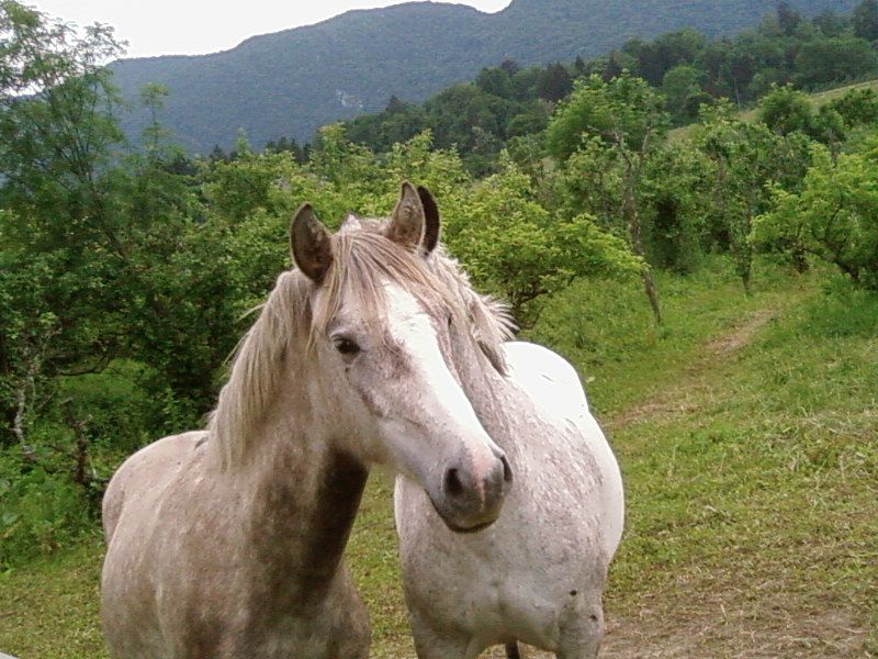 ) et il avait tendance à me coller vraiment de trop: au moindre déplacement il me suivait, j'avais beau le repousser deux secondes plus tard j'avais à nouveau son pif sur mon épaule à me mordiller plus ou moins sévèrement, bref j'ai vraiment eu du mal à le supporter dans la mesure ou mon autre cheval qui vit avec lui au pré, est très sensible mais plus distant, pas du tout tactile, je n'étais donc pas habituée à ce type de cheval et ça me déstabilisait, sensation d'être oppressée et pas loin d'en avoir un peu "peur".