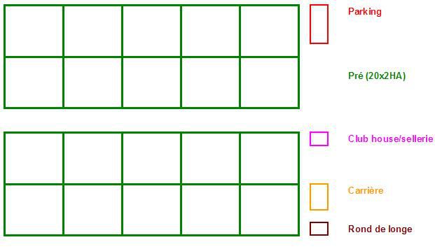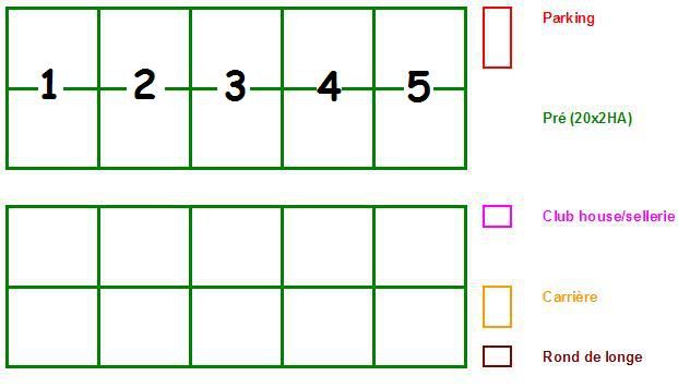 | Dire merci | Tyoc c'est pas idiot sauf que ca me semble dangereux, si un cheval se fait coincé dans l'angle créé par la cloison et se fait taper par un autre... J'avais pensé à ca cloturer avec des poteaux en bas la moitié de la séparation (en vert) et des piquets en platiques la séparation amovible que je changerai tous les 3 mois (en bleu). En rouge: abris En jaune: sable rajouté pour éviter la boue l'hiver Qu'en pensez vous??? ![]() ![]() |