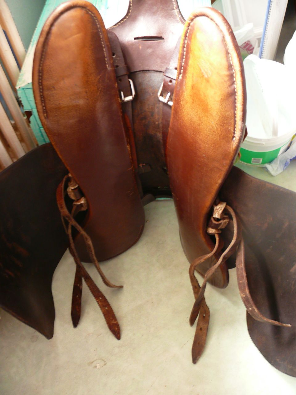 Déconnecté | L'année dernière je me suis fait avoir avec une selle à 60€ indiquant une petite restauration ( selle de chasse début du XXème siècle ) : voici ce qu'elle avait comme problèmes : faux quartiers déchirés au niveau de l'arçon ( deux côtés ), quartiers déchirés au niveau des avancées ( deux côtés aussi ), matelassure à refaire. Bref après renseignements pris auprès d'un professionnel de selles anciennes il aurait fallu prévoir 1000€ pour la restaurer, à ce prix là on a mieux. J'ai fini par la donner pour déco. La seule utilisation possible : débourrage. et en plus elle dégageait une odeur désagréable ( pas la bonne odeur de cuir ). |