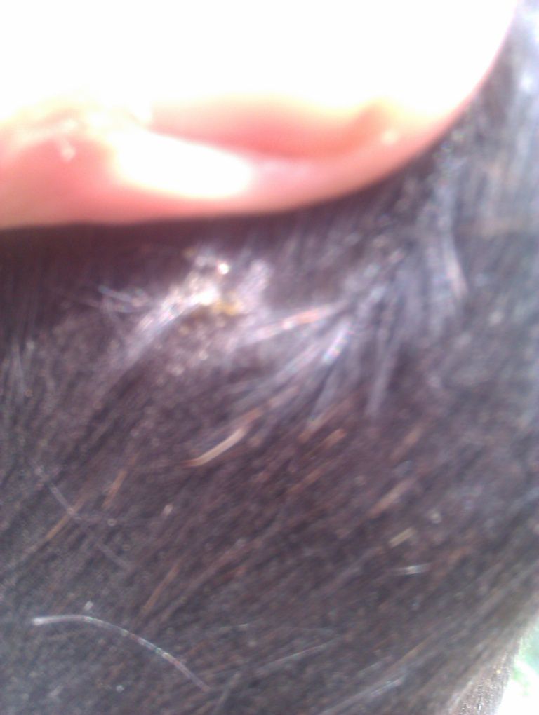 | Dire merci | Sur les photos de la touffe de poils dans ta main, on dirait les croûtes jaunâtres que font les tiques quand on les enlève pas hyper rapidement. Mais les lésions sur la tête n'y ressemble pas du tout, du coup ça t'avance pas beaucoup. |