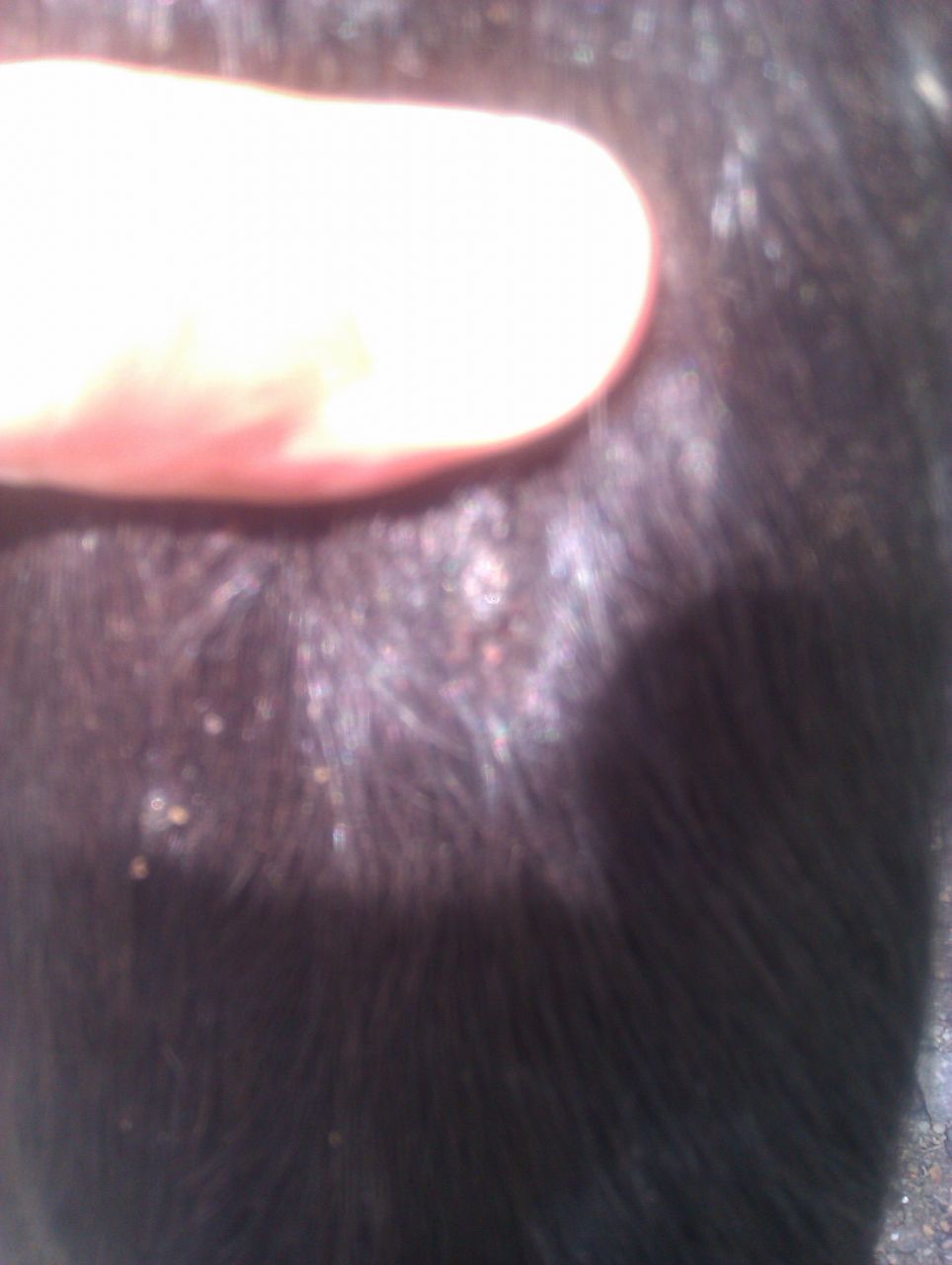 | Dire merci | Dermatophilose. Comme c'est très peu étendu, sur un cheval sain, dans de bonnes condition, ca partira tout seul. |