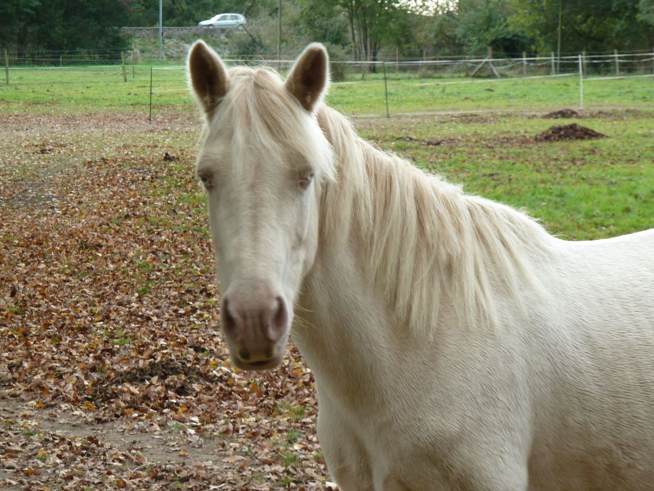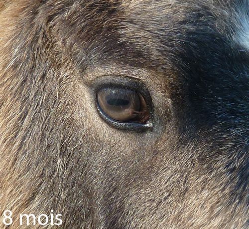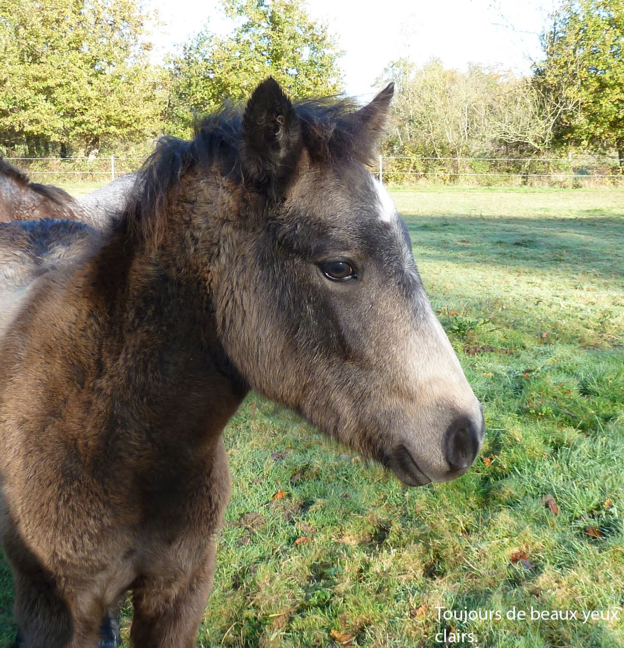 | Dire merci | Les chaussettes noires à la naissance sont un signe qui laisse penser qu'il va grisonner. Par contre la couleur des yeux est typique des chevaux porteurs d'un gène crème, ce qui est obligatoirement son cas puique sa mère est homozygote. |