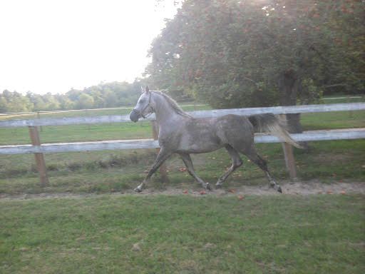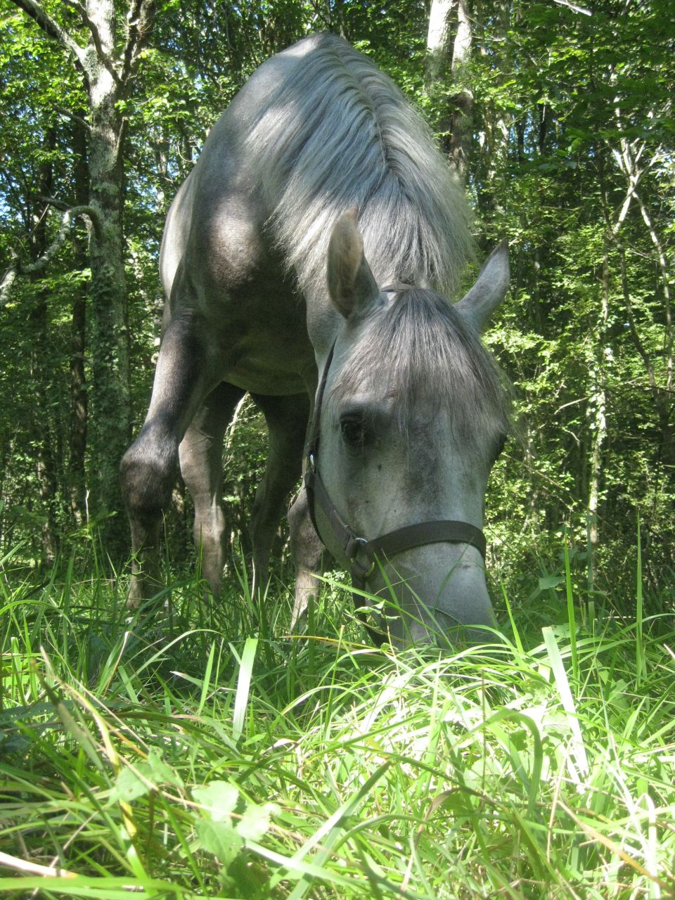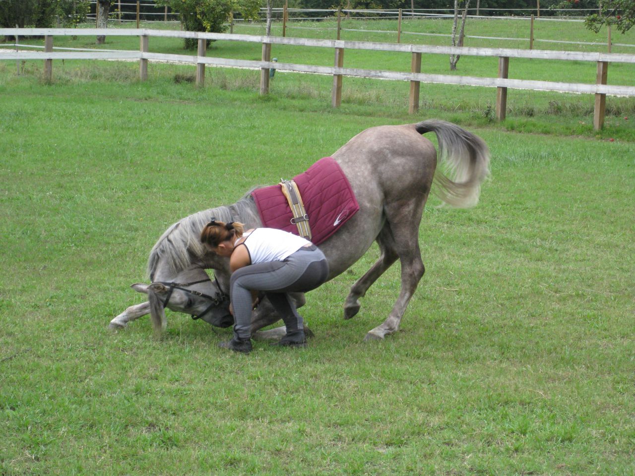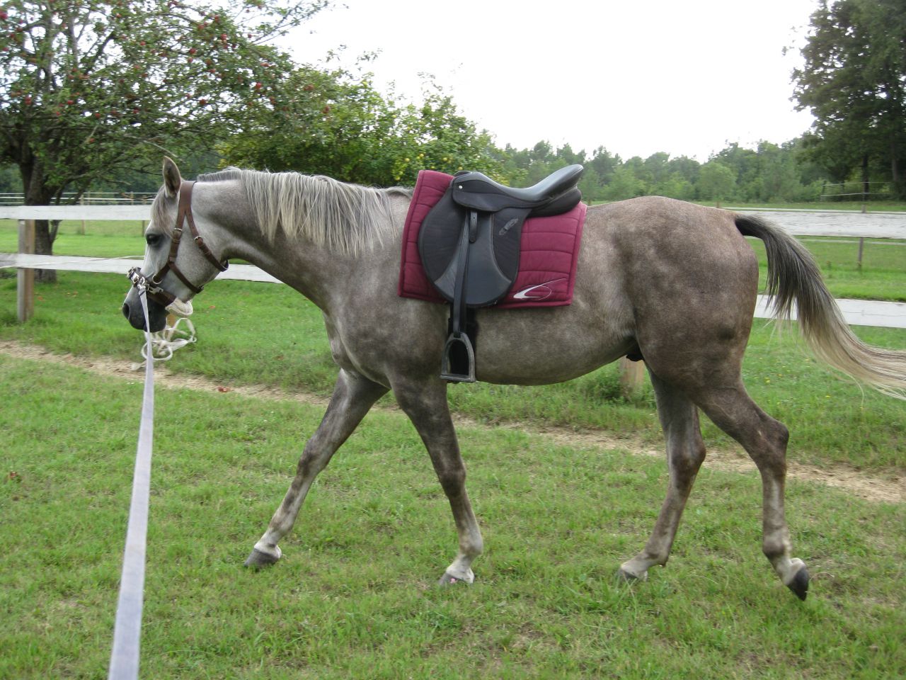 | Dire merci | Bonsoir , L'idée du siècle ..... Hummmm , non , je n'ai pas cette prétention !!!! Loin de moi !!! Pour le machins cirquesques .... le campo s'apprend en une quinzaine de jours à hauteur de 10 min , 4 fois /semaine et ce n'est qu'une phase transitoire pour aboutir vers la révérence.... mais peu importe. Pour répondre à Beeboylee , effectivement ceci ne prépare en rien le débourrage à proprement dit . Peut-être êtes-vous un adepte de la méthode Blondeau ... moi pas du tout. En revanche , j'apparente ces petits exercices à des manipulations autres que brosser son cheval !!! Pour venir du monde CSO et CCE ....je ne vous rejoins pas quant au fait que les "arabes " se creusent plus que les autres races .... mais peut être s'agit-il là de votre ressenti?! Que les arabes soient plus souvent gris que les selle français ou AA , oui , c'est prouvé par des statistiques.... pour la qualité de leur dos , j'en doute fort !!!! Concernant son dos , il a une trés bonne ligne de dos. Lorsqu'il se déplace , il tient trés correctement son garrot qui fait preuve d'une grande mobilité et élasticité!! Je préfère ce travail là à lui imposer de gros dénivéles... pour un jeune de 2 ans et demi passé. Pour le reste, Hidallgo apprends trés vite et semble s'ennuyer rapidement ... mais chaque chose en son temps !!!! Pour le travail à pied en licol side pull, placée en arrière du garrot , il a pigé les indications de rênes au pas en 2 séances de 10 min . Il obéit aux ordres " marche " trotté" et "stop". Ce matin ballade à pieds , dans les bois , routes, et vignes .... un vrai toutou !!!! Je suis à l'écoute de vos remarques mais encore plus à l'écoute d'Hidallgo. Je suis trés ouvertes à vos conseils pour désensibiliser aux vaches!!!!! |