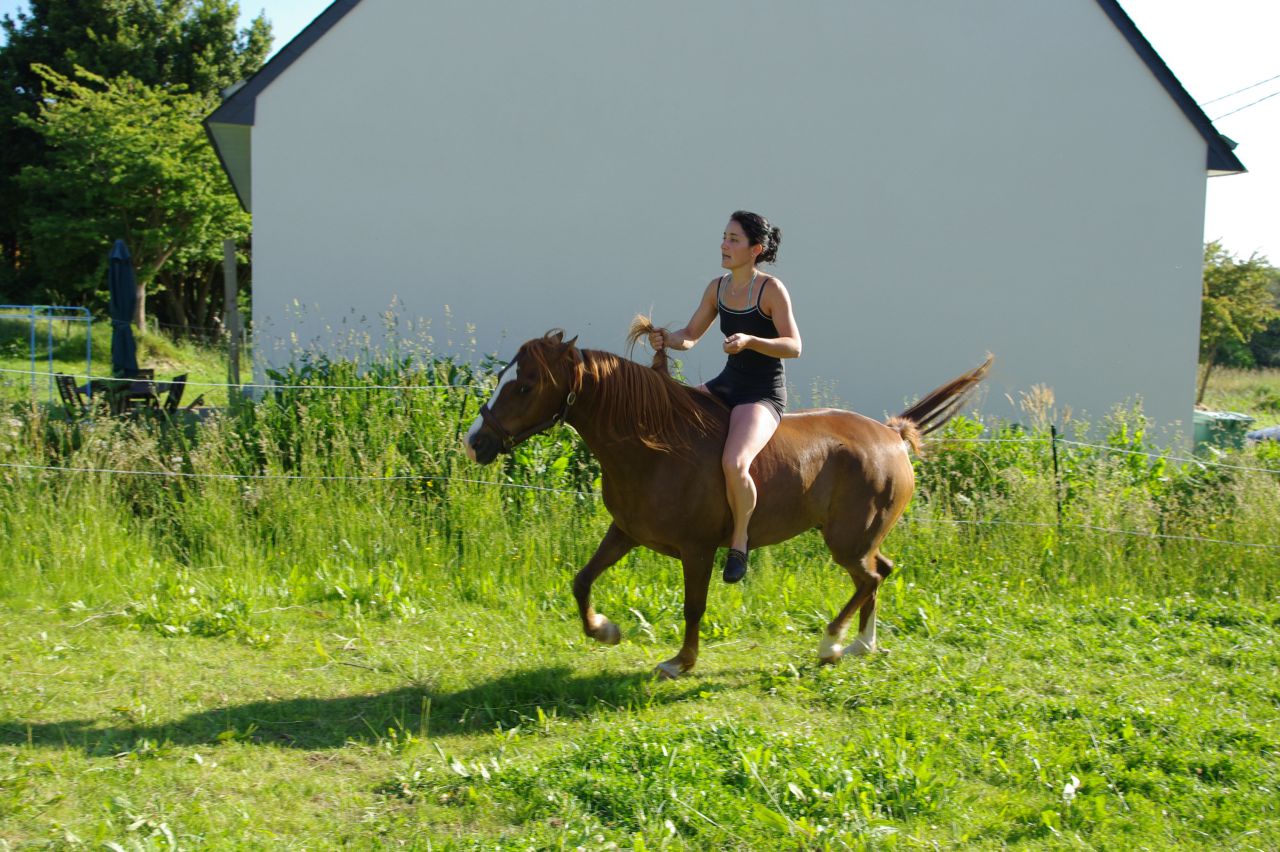 Ocean se barre au galop au moment ou j'amène le stick sur l'épaule, plein balle dans la pâture en pente, dans les branches basses, pas moyen d'arrêter. Je lâche le stick, rien à faire. Il s'arrête tant bien que mal dans le cul de son pote. Je descend, gueule un coup (mauvaise idée, je sais ..), reprend quelques exos a pied, remonte dessus, part au pas "histoire de", demande un arrêt a la voix .. Et bam, il repart plein cul !