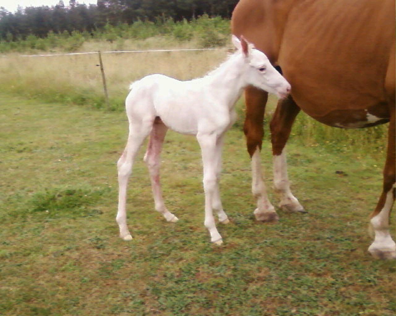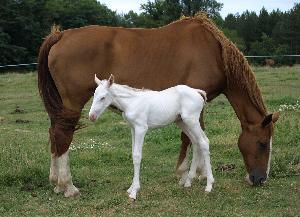 | Dire merci | les "blanc, peau rose, yeux bleus" sont crème et pas blanc, porteur du gène Cr, double dilution de l'alezan sa simple dilution est le palomino. Un cheval vlanc à la peau rose et les yeux noir. Le léthal white n'a rien à voir avec les chevaux blanc ou crème, mais c'est issu des chevaux ovéro. 2 Ovéro peuvent donner naissance à 25% à un poulain porteur du LWO, ce poulain décédera en 24h, on appelle aussi ces poulain, des albinos, poulain qui ne sont pas viable, . C’est aussi pour ça qu'on dit que les chevaux albinos n’existent pas. |