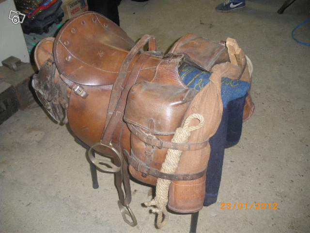 Déconnecté | En voici une qui est complète : Lien ![]() ![]() SELLE D'ARME DATEE 1920 COMPRENANT UN TAPIS DE SELLE DATEE 1907,UNE PAIRE DE FONTE,UN SAC A AVOINE,UNE CORDELETTE,DES PIQUETS DE TENTE,UNE POCHE A FER |