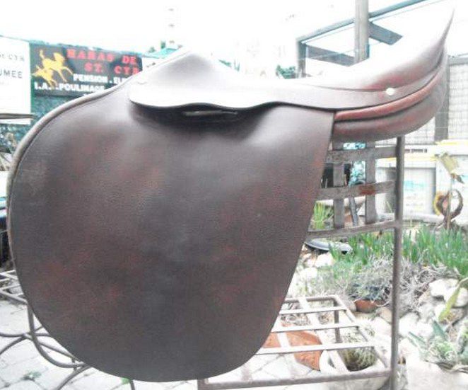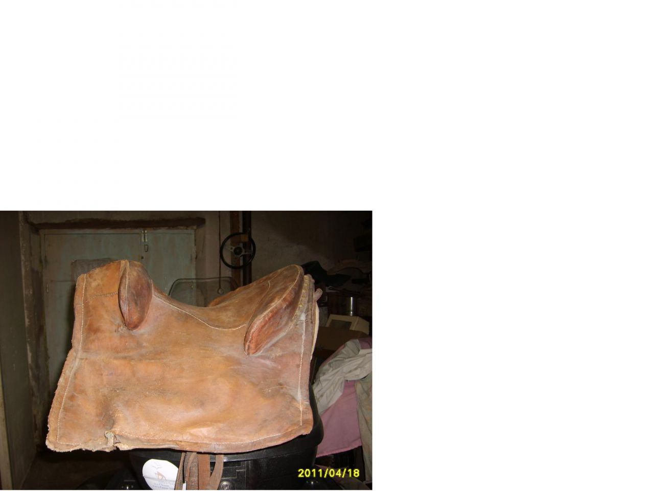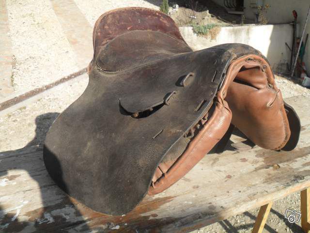 | Dire merci | La derniere a ete refaite avec du simili cuir...ca ne vaut rien! ![]() Le (soir disant)tapis de cuir est une selle de maquignon...Ils s'en servaient pour essayer les chevaux dans les endroits innaccessibles.c'etait moins lourd a porter a bout de bras qu'une selle avec arcon. |