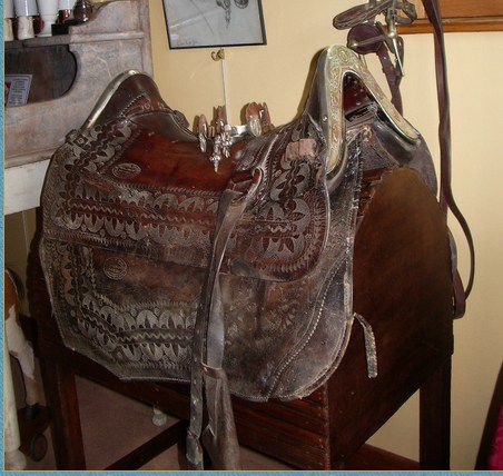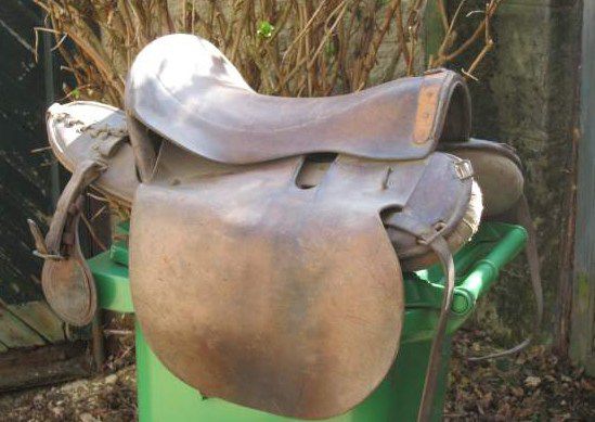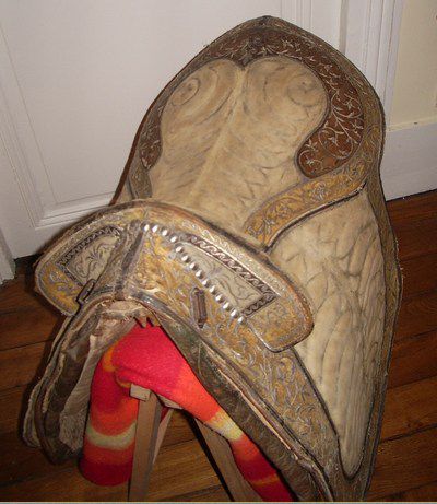 | Dire merci | Au dessous, il manque le cheval. Blague à part,il s'agit d'une 1894 de gendarmerie. Pour un gendarme costaud, 2 sabres il faut le faire. Bon, une seule "oreille" nom familièrement donné au boucletau et à sa plaque de frottement. Cette selle est dérivée de la 1874 pour la gendarmerie: les rivets du troussequin sont sous le siège, pour ne pas salir la culotte blanche des gendarmes. Si personne en veut, je vais peut être la prendre, j'en ai déjà 4 mais bon, 2 oreilles..... |