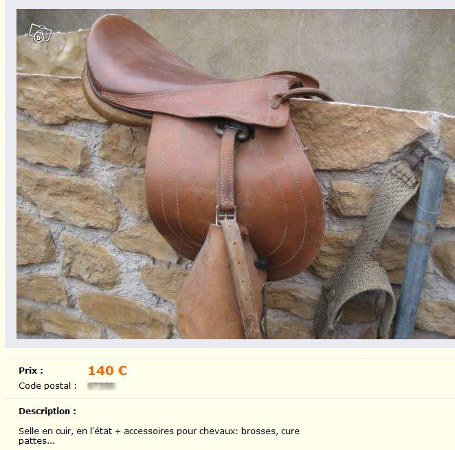 Déconnecté | pour la selle allemande il faut faire une proposition, soit il faut la contacter directement sur le site soit je donne l'email pour la contacter. finalement je lui ai demandé si elle accepte une offre à 60€ Message édité le 05/04/12 à 16:20 |