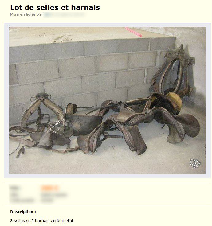 DéconnectéDire merci | Princesonor papyrus j'ai besoin de votre aide SVP j'ai récupérer deux selles, enfin je crois elle sont spécial elle ressemble à la selle page 3 ou tu dis:" un bât en parfait état " elle sont rembourser en crin de cheval il y a une boucle sur pommeau comme celle de la page 3 je penser à des selle d'attelage mais j'y connais rien dans ce domaine! Je vais demander à ma chérie de mettre les photo sur ce post ( moi sais pas faire) elle sont en état pas trop mal j'aimerai savoir combien ça pourrai coûter sachant qu'elle peuvent être utilisé |