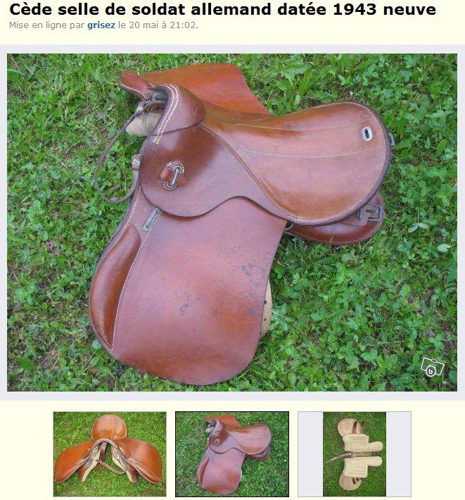| Dire merci | Bonsoir ! J'ai cette vielle selle ![]() ![]() J'aurais voulu savoir si c'était bien une allemande ww2 et à quoi correspondent les numéros sur un des quartier et sur "l'attache" à l'arrière (c'est pour une croupière ?) Elle a été rafistolée mais est encore en bon état ! D'après vous elle date de quand ? Message édité le 14/07/12 à 20:47 Message édité le 14/07/12 à 20:48 |
