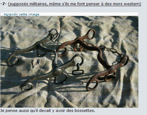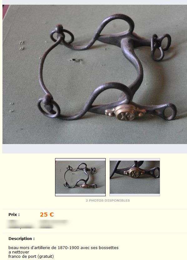 | Dire merci | Le mors Anglais est le mors de bride qui équipait pratiquement toute la cavalerie, d'ailleurs le vendeur l'explique très bien dans l'annonce. Le mors de bride avec les bossettes à grenades qui sont montées à l'envers est pourri mais intéressant, pourquoi les bossettes à l'envers ? j'en ai plusieurs qui sont montés en pendulettes. y a t'il une autre explication ? |