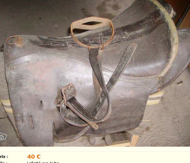 | Dire merci | Bonsoir , non, là vous ne me tentez pas, des selles de ce style, j'en ai pas mal, une des multiples selles dites de voyage 18/19ème, celle là semble avoir pas mal souffert. En tout cas ce sont de très belles pièces (a mon goût). La 1861 d'artillerie d'en dessous semble avoir pas mal vécu aussi. En tout cas, à la page 48, au dessus de la selle que j'ai achetée en Allemagne, une rareté m'est passé sous le nez et je ne l'ai pas vue : une 1874 de cuirassiers (à 7 rivets) à 10€, heureusement c'est un ami qui l'a eue et je suis content pour lui. |