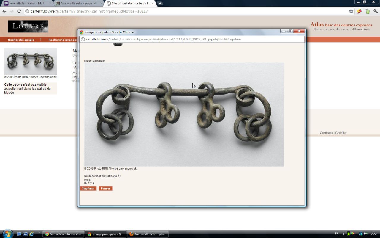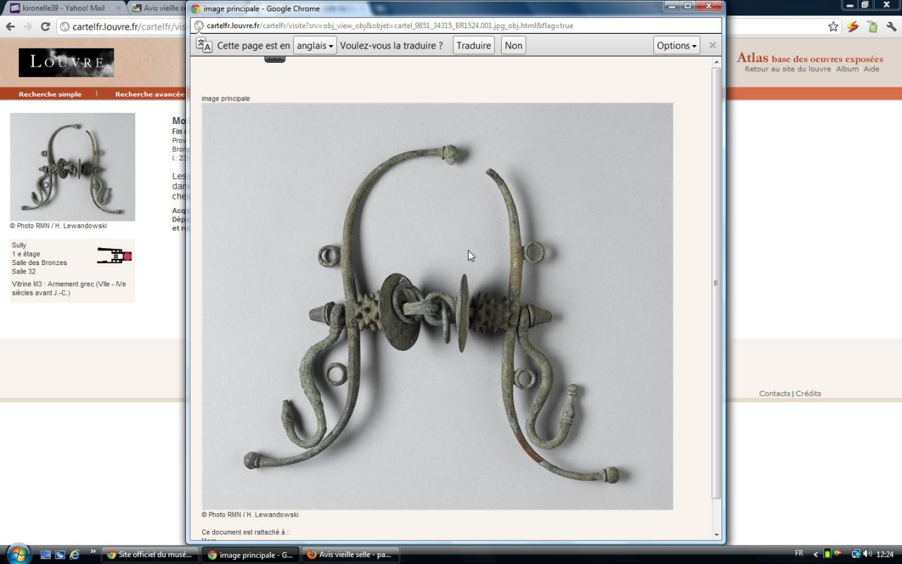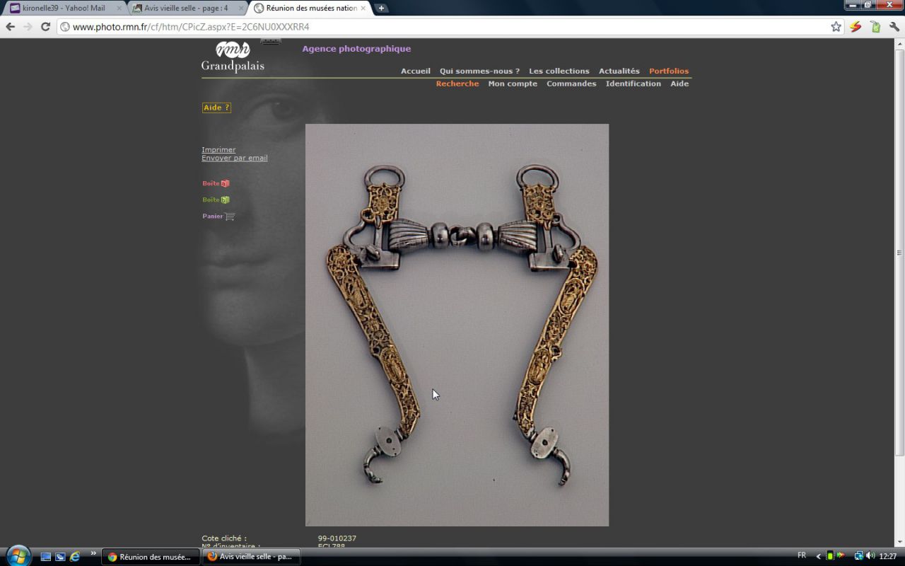 | Dire merci | Arrêtes tu t'emballes!!!!!! Je sors du site et je me suis tapée les 45 pages ![]() Magnifiques représentations en tous cas Sur ce que j'ai vue, ça a bien l'air du Napoleon III ... La description du mors c'est: Branches en forme de S a la Condé,embouchure a pas d'âne et 6 annelets... 19ème Siècle ![]() Un collectionneur voulait me l'acheter a 600€ un jour...C'est là que je me suis dit qu'il était ancien. J'ai vue le même mais mors droit a 300€ aux enchères une fois... |
