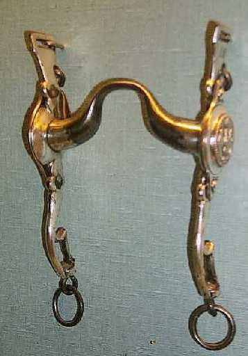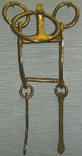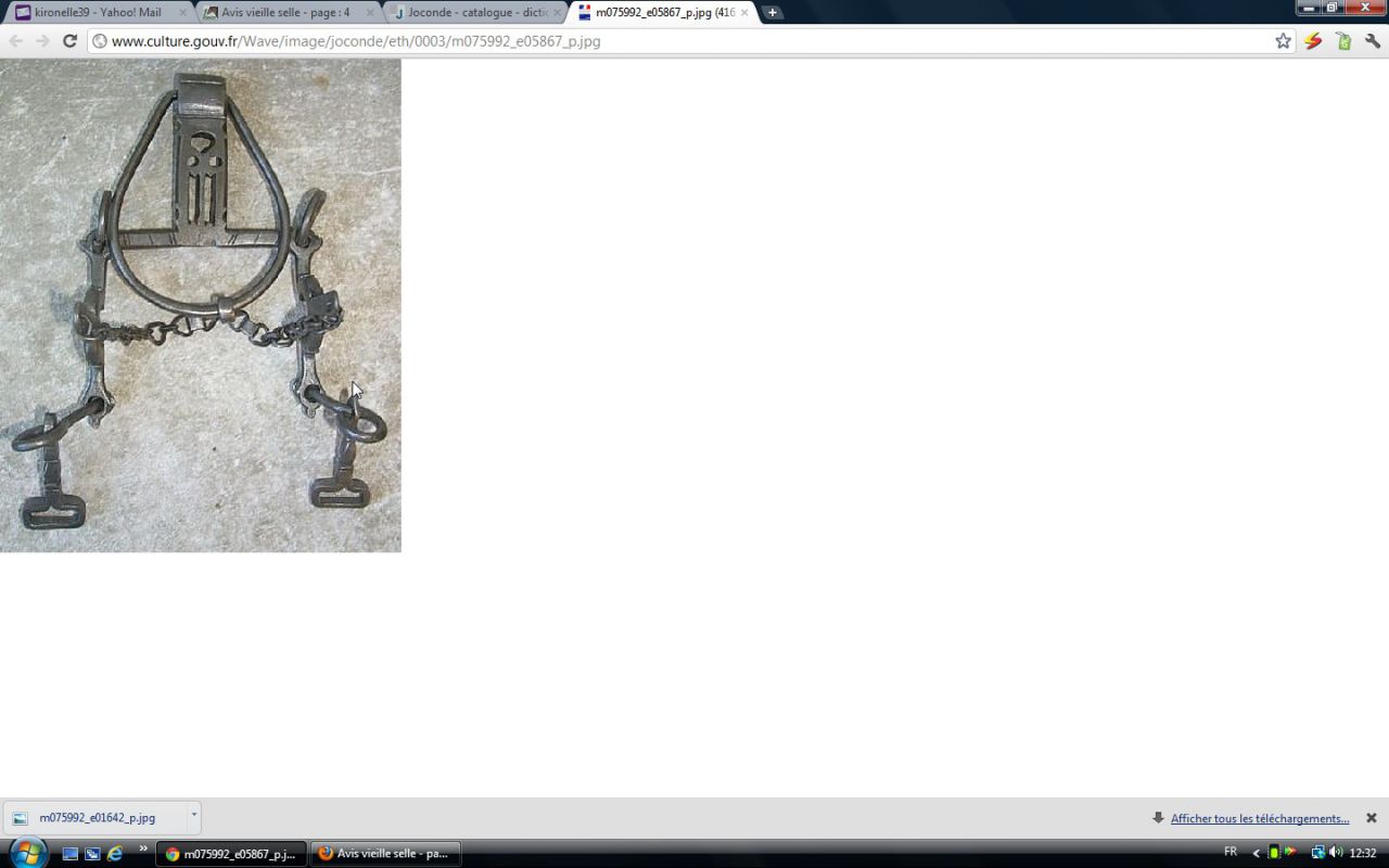| Dire merci | Puisque l'on est dans les antiquités,j'ai un mors qui serait (?) de l'époque Napoleon III. Seulement voilà,tous les mors que j'ai vue de cette époque sont des mors droits alors que le mien est articulé avec des mollettes aux canons et un grand passage de langue: ![]() ![]() Si quelqu'un a une idée.... ![]() |