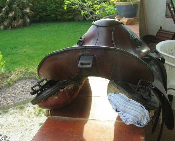 Déconnecté | C'est moi qui avait été mal reçue car pour cacher et protéger la déchirure de ma selle à palette j'ai mis du cuir autocollant. Certains ont cru que j'avais mis la selle sur un cheval et que je l'avais essayé telle quelle alors qu'en fait c'était sur une panière à linge ( beaucoup moins dangereux surtout que je n'étais pas du sûre de l'arçon ). C'est surtout le cuir qui a fait bondir. En l'achetant je n'avais pas fait attention à la photo et pensais acheter une WW2 donc j'avais tout prévu pour recoudre et lorsque je l'ai reçue je me suis rendue compte de mon erreur et là je me suis retrouvée "coincée". Le cuir autocollant était prévu pour mettre en dessous d'une WW2 afin de rendre plus solide la couture. Pour l'instant je me suis juste occupée des matelassures déchirées. Si un jour j'ai les moyens je la ferai restaurer mais bon faudra encore trouver un bourrelier apte à ce genre de travail. |