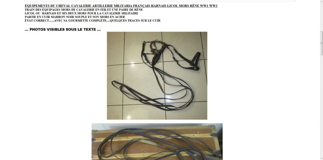 | Dire merci | Bride de cavalerie Française modèle 1874, les rennes de filet ne sont pas du modèle, toute la bouclerie est normalement en laiton. Sinon le reste n'est pas mal et comme dit Papyrus, il manque le licol de parade. |
