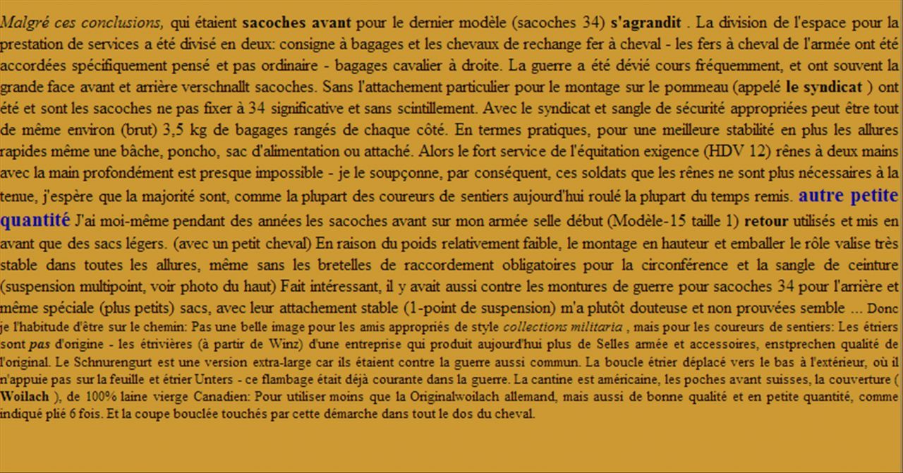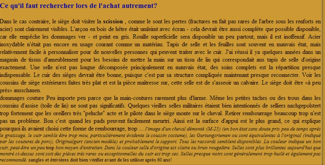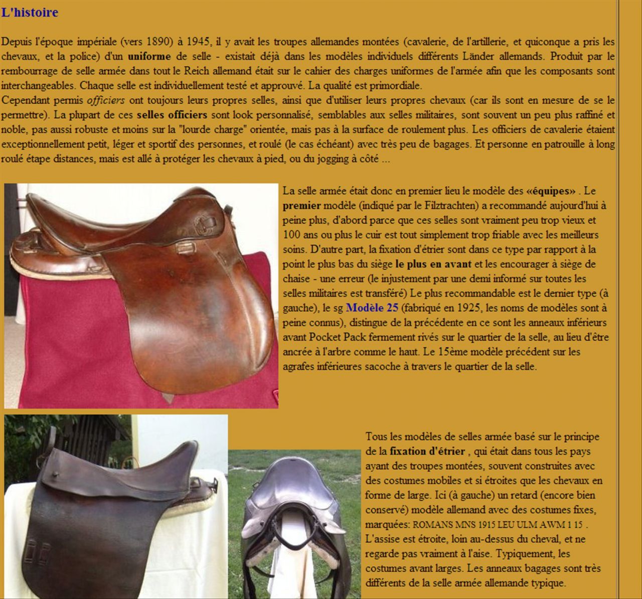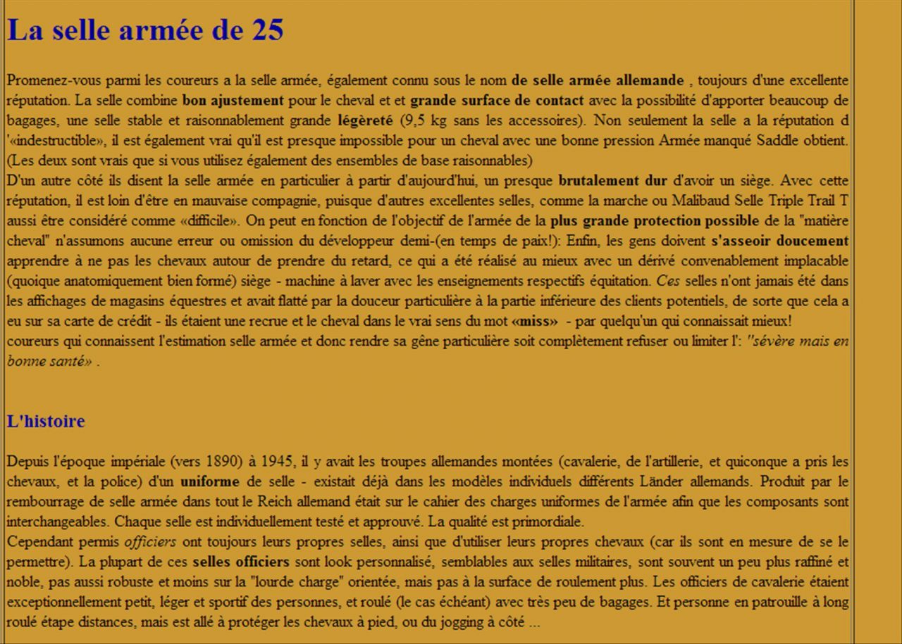 Déconnecté | je viens de trouver une page avec une selle ressemblant beaucoup à la mienne avec le même numéro que moi 53 Lien après avoir lu l'article et les traductions ma selle est hongroise avec une influence allemande ( ils se sont basés sur le modèle 25 : armeesattel 25 ). Message édité le 13/12/12 à 21:22 |