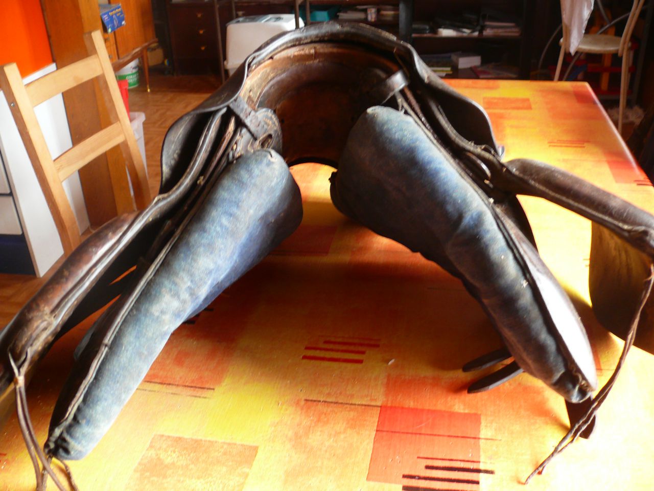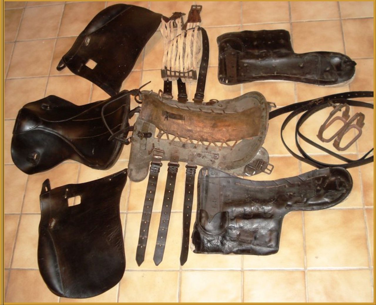 | Dire merci | Bonjour, Je ne suis pas "spécialiste" des selles de poste, j'en ai 3 ou 4, L'âge est difficile à dire , ces selles à la Daumont ont été très utilisées aux XVIII et XIXème elle vient d'Allemagne, je ne connais pas trop leur histoire à ce niveau. L'étrier de droite est la pièce avec un coussin que l'on voit bien sur la photo cette pièce empêchait je crois l'écrasement de la jambe du conducteur contre l'attelage. Mon truc, c'est plutôt les selles d'arme Française, d'ailleurs, si quelqu'un a une très belle selle d'officier de cavalerie légère à palette, je ne suis pas contre un échange. |