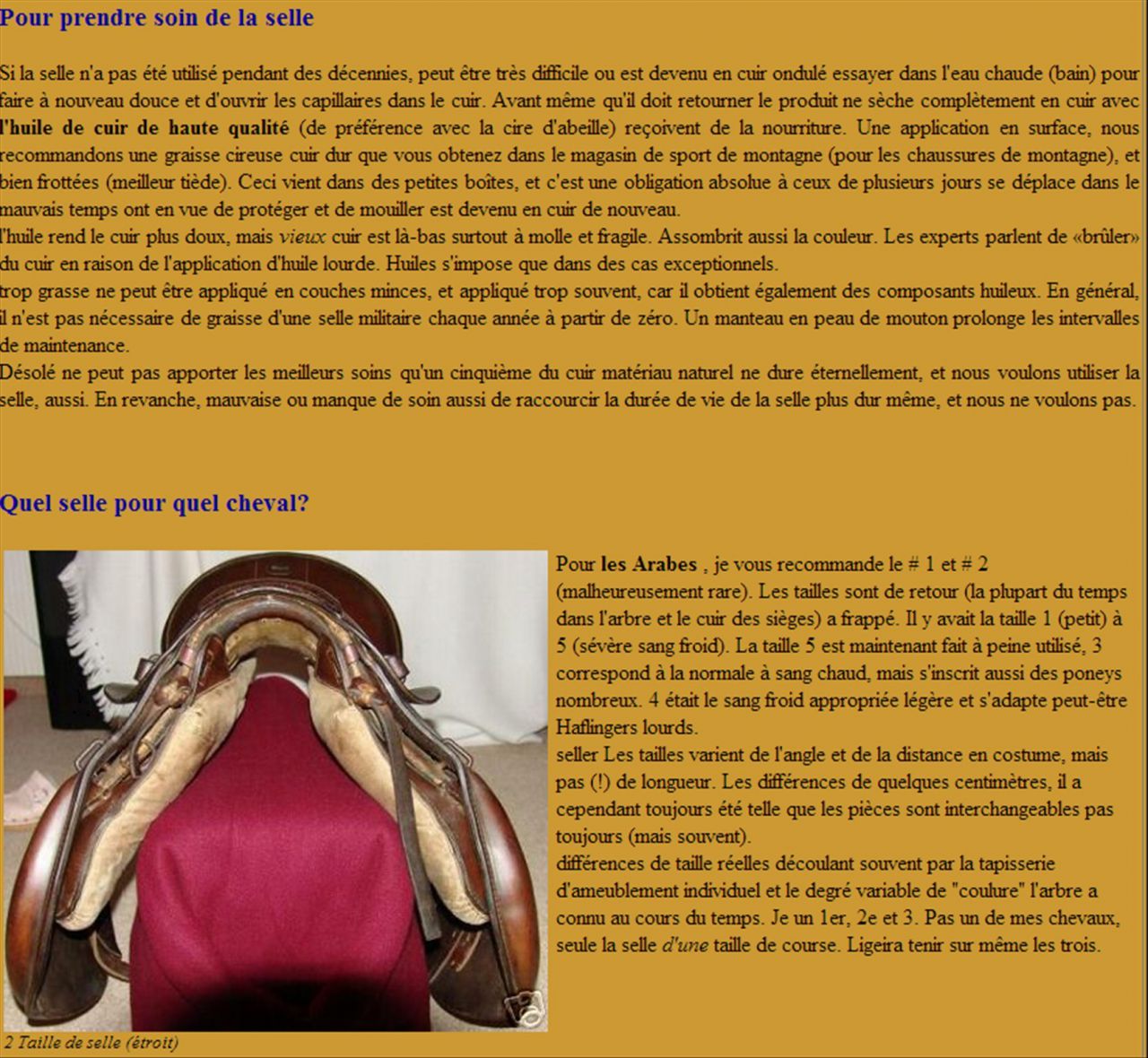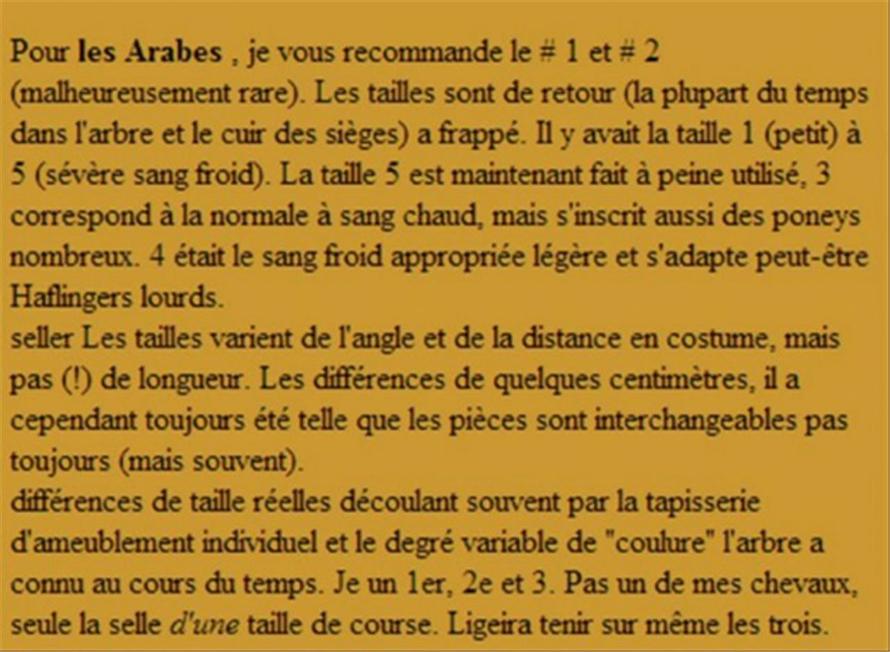 Déconnecté | ce soir j'ai mesuré les deux selles car j'avais quand même l'impression que la nouvelle est plus grande, résultat : - 1ère selle : longueur troussequin-pommeau 45 cm, largeur arçon pris en haut des matelassures 12 cm - 2ème selle : longueur troussequin-pommeau 47 cm, largeur arçon 14 cm. donc ce n'est pas une taille 2 mais plutôt une taille 4 car la taille 5 est nettement plus large ( voir lien plus haut ). Sur la deuxième les matelassures sont plus longues malgré que les quartiers soient plus courts mais plus larges. |