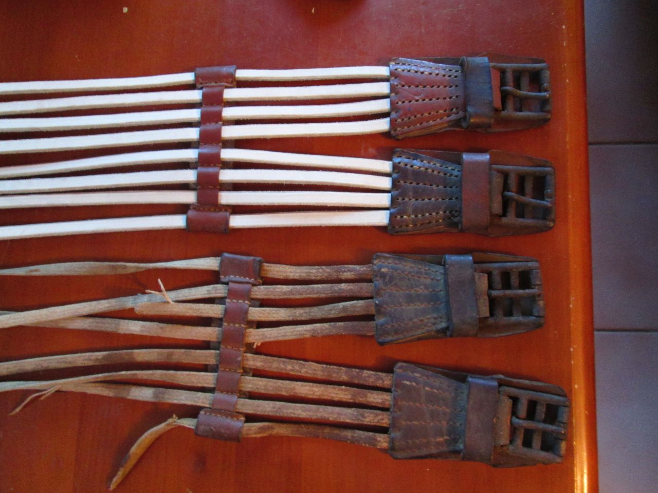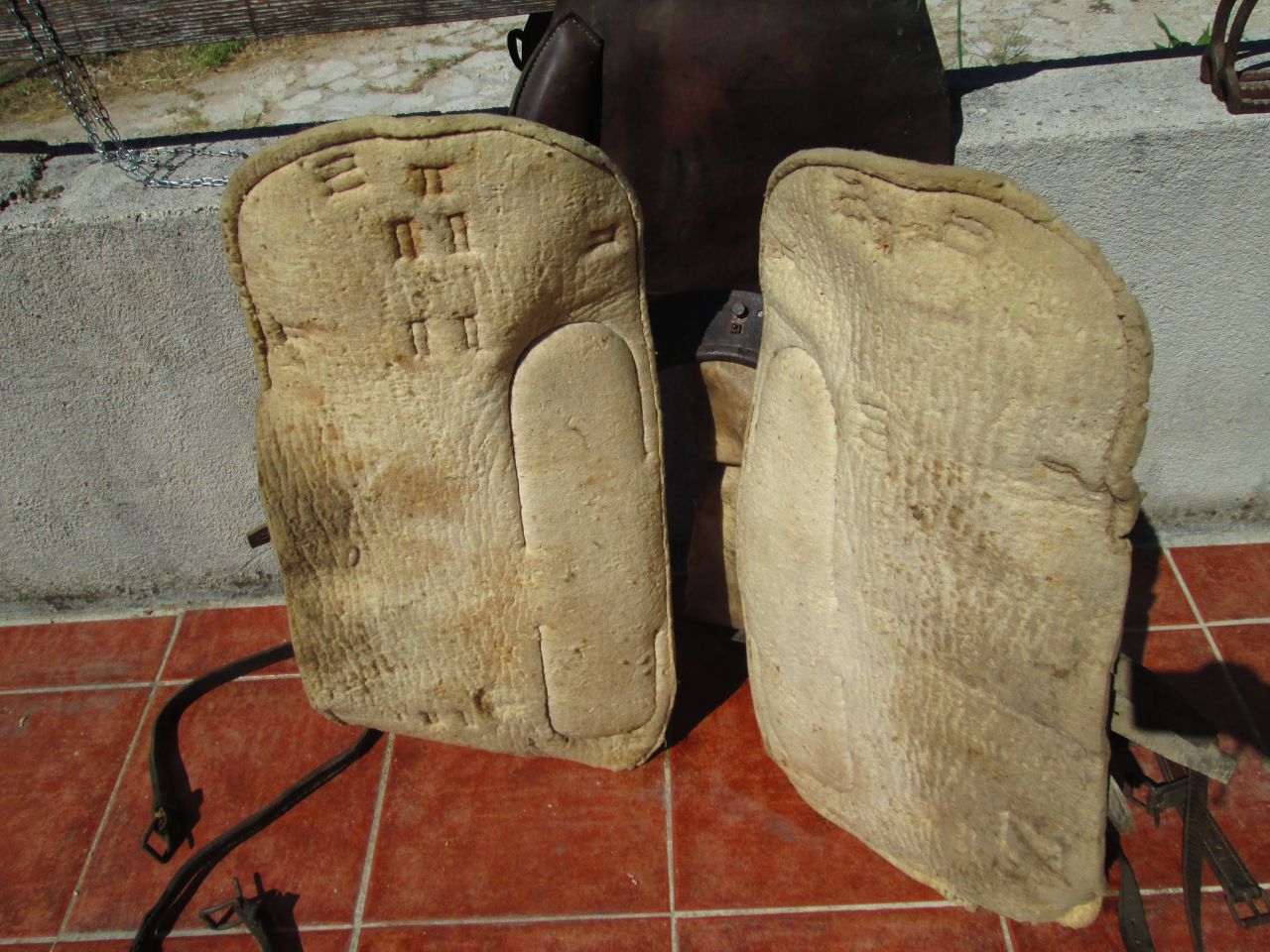 | Dire merci | Finalement je ne la garde pas,j'ai commençé la restauration mais elle sera plus appréciée par un collectionneur averti... J'ai déjà refait les lanières du loup en cuir cru Lavée,graissée et redressée ça va mieux! ![]() ![]() ![]() |