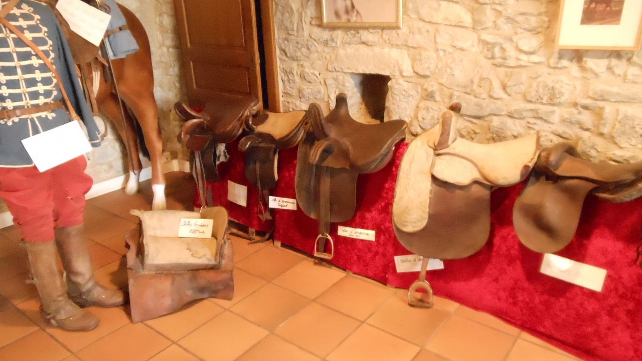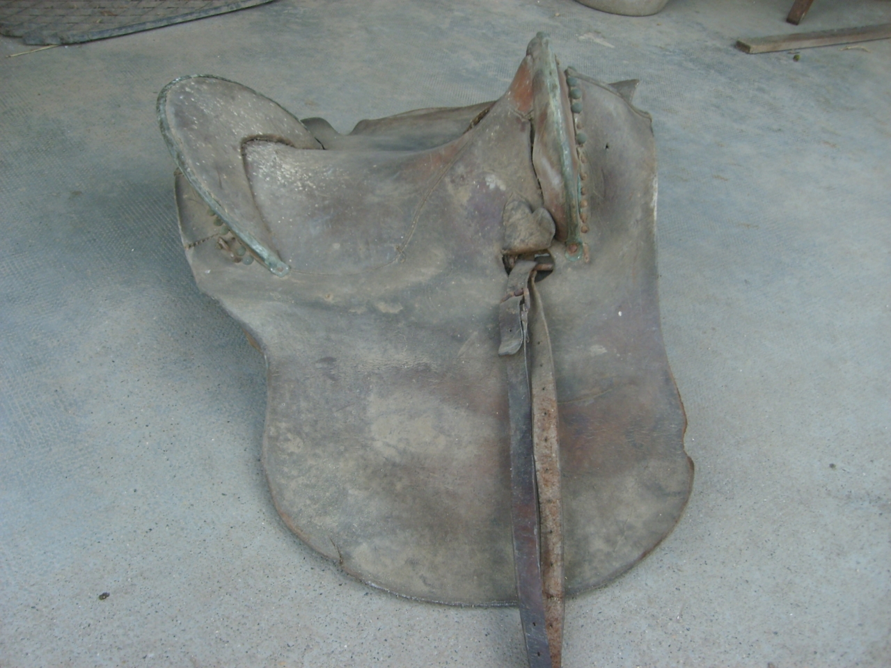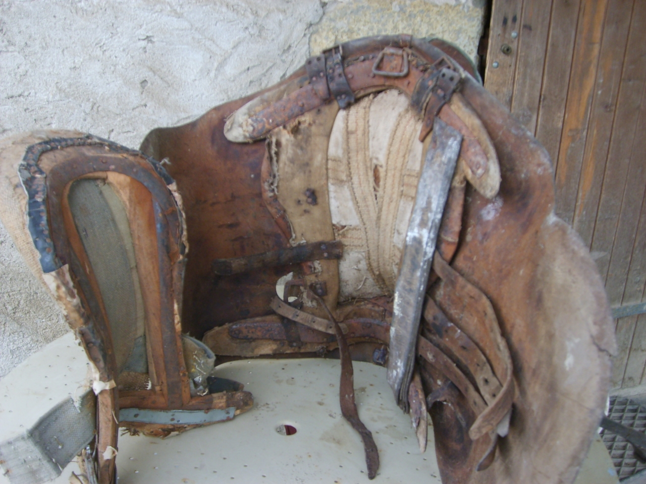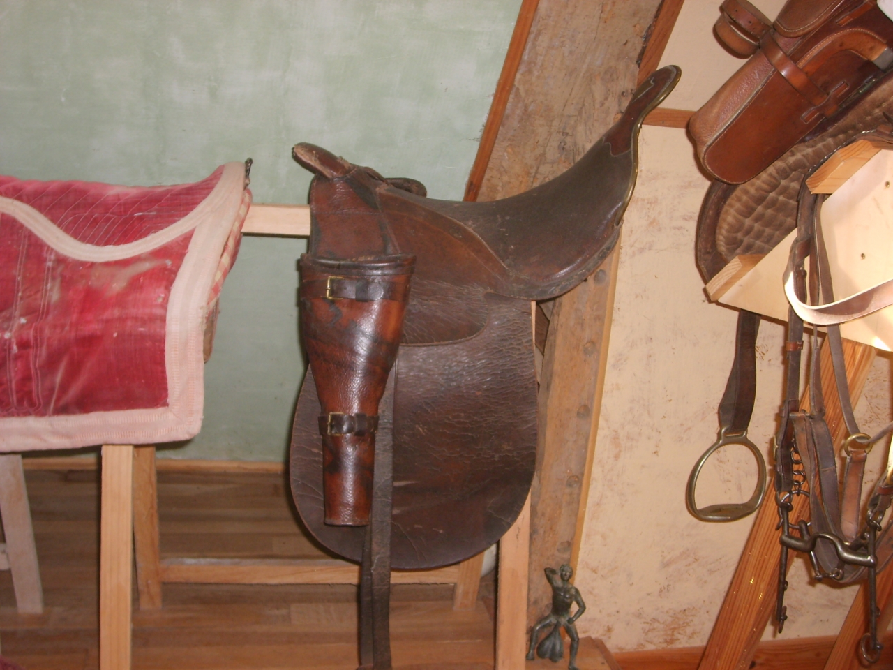 | Dire merci | Je vais essayer de répondre à certains points en "vrac" : je suis d'accord pour ce qui concerne la reconstitution, ce n'est pas la vraie vie. Pour les selles avant 1850, je n'en ai pas vu beaucoup de marquées, militaires ou civiles, j'ai seulement une selle "de voyage" qui est marquée "Capoulade à Laguiole". Les clous de selle marqués , c'est courant à partir de 1880, Pour les selles d'amazone, je vous les présenterai plus en détail. Alors, le pommeau étrange n'est pas du tout rajouté , la selle est une demi française: pommeau à la française et troussequin à l'anglaise, modèle très fréquent 19 ème et début 20 ème. Sur la photo vous avez par terre une fermière et de gauche à droite une 2 cornes à gauche, une 2 cornes à gauche d'enfant, une 3 cornes, une 2 cornes à droite et la demi française qui s'apparente à une selle actuelle. Faust voyons des photos et normalement nous devrions vous renseigner, il s'agit certainement d'un ensemble d'officier de la 3 ème république. |