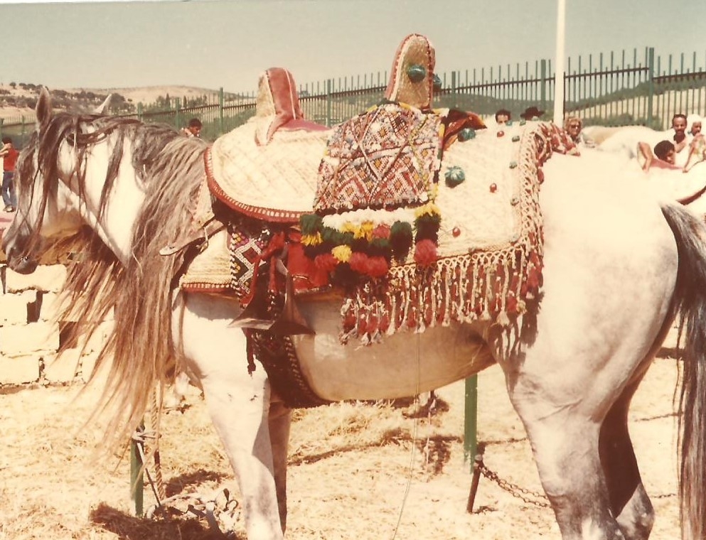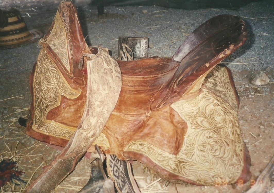 DéconnectéDire merci | ![]() ![]() ![]() La selle arabe a des différences selon quelle soit Algérienne, Marocaine, ou Tunisienne, cela tien dans la hauteur et la largeur, du pommeau et du trousquin. J'ai vu des selles magnifiques, brodées de fils d'or et d'argent, certaines avaient plus de 100 ans, d'autres plus ordinaires. Les chevaux sont entravés au sol, les 2 antérieurs et 1 latéral, ils peuvent se coucher. Ils sont soignés, très bien nourris, mais durant les épreuves de fantasia, ils sont mené très dur sans aucun cadeau. Ils sont tous gardés entier. La selle est un modèle d'inconfort, ils sont souvent en suspension, ne pratiquant que le pas ou le galop. L'arçon est recouvert de parchemin, on enfile par dessus une chabraque de cuir fin. Le tapis à 7 épaisseurs de feutre remplace les matelassures. Ils chaussent des bottes sans semelles, leurs éperons sont très long et très rudes, car ils chaussent très court |